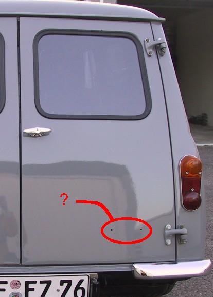 Nu hab´ ich mal ´ne Frage. Hinten sind zwei Löcher in der rechten Tür für´s Typenschild (siehe auch Anhang). Welches Typenschild kommt da drauf und hat jemand eine Bezugsquelle für selbiges? Es handelt sich um einen Traveller, nicht um den Clubman Estate.