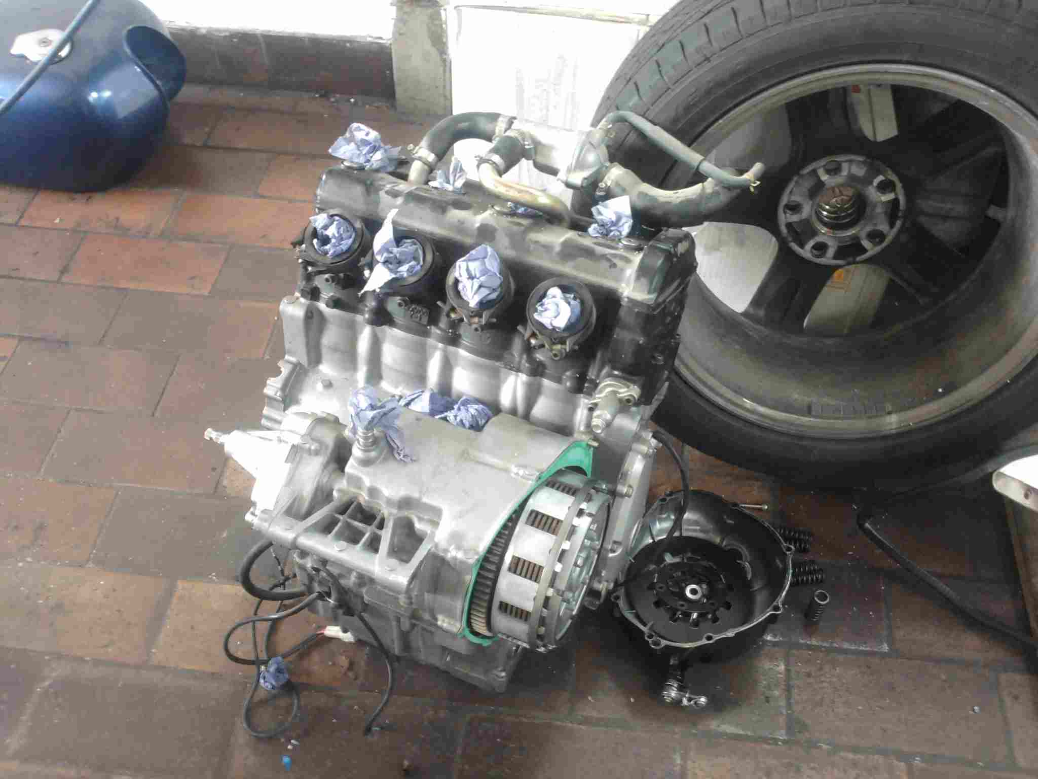 OK..dann leg ich einfach mal los, und beginne von ganz vorne: Das gute Herzstück. Aus einer geschrotteten Yamaha YZF R1. Vergasermaschine RN01 aus dem Jahre 1999. Die Daten sind ja grösstenteils bekannt, aber trotzdem: Reihenvierzylinder mit 998ccm, 5 Ventile Pro Zylinder und zwei obenliegenden Nockenwellen, 110 kW (150 PS) bei 10.000/min. -