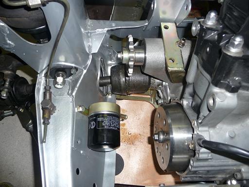 Auf den Bildern kann man erkennen, wie die Engländer das Problem lösen. Der Ölfilter ist seperat am Rahmen befestigt, wo das Öl über die Flexleitungen zum Ölkühler läuft. Auf dem ersten Bild sieht man die "Reverse-Box". Über ein Seil zum Innenraum kann man dort die Drehrichtung vom Getriebeausgang wechseln. D.h. 6Vorwärts-, und 6Rückwärtsgänge:thumpsup:!!