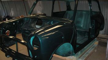 Die Karosse ist komplett geschweißt, Epoxidharzgrundiert/ gefüllert und lackiert. Haube, Türen und der Kofferraumdeckel sind auch schon bearbeitet und lackiert.