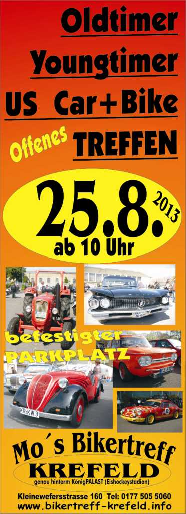 Am kommenden Sonntag, dem 25.August ist wieder in Krefeld ein offenes Old-Youngtimer und US CAR+Bike Treffen. Auf dem weitläufig vollasphaltierten Parkplatz von Mo´s Bikertreff laden die Oldtimerfreunde Hüls 1990 und die Oldtimerfreunde Krefeld-Nord 2012 monatlich zu einem lockerem Stelldichein. Ohne Eintrittsgelder, Standgebühren öder ähnliches sind ab 10 Uhr wieder Oldies aller Klassen eingeladen ihre Fahrzeuge vorzuführen. Dabei sind hier nicht nur Oldtimer, sondern auch Youngtimer und Showfahrzeuge aller Altersjahrgänge willkommen. Ebenso sind wieder US Cars und Bikes eine tolle Bereicherung des Treffens hinterm Krefelder Eishockeystadion „KönigPALAST“.