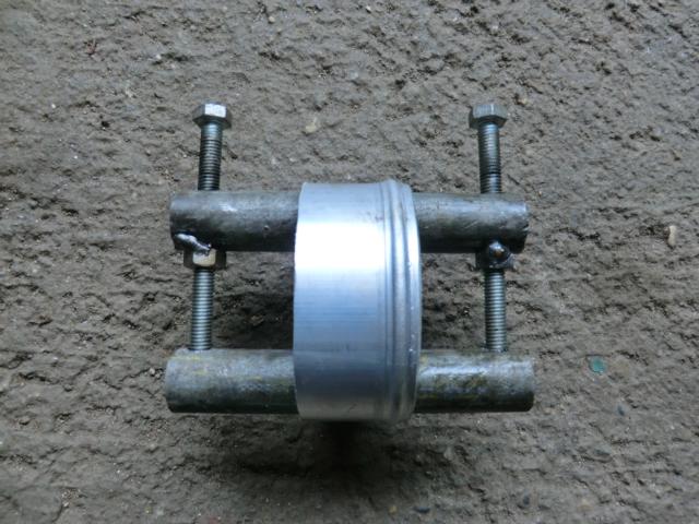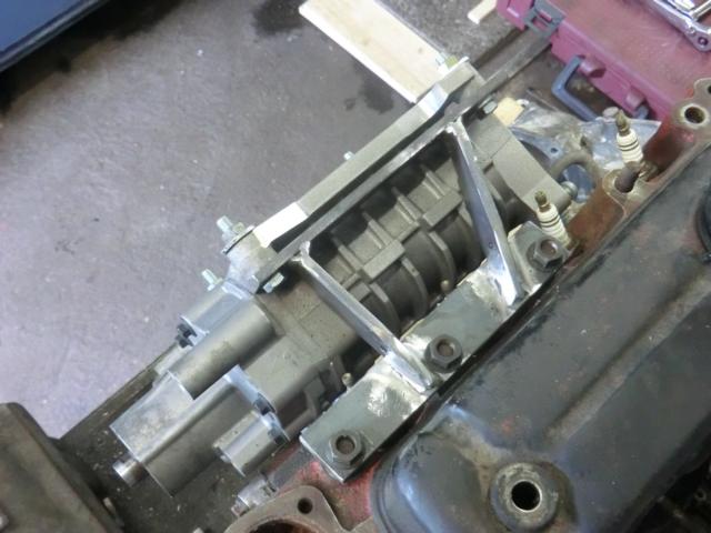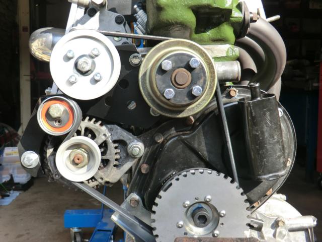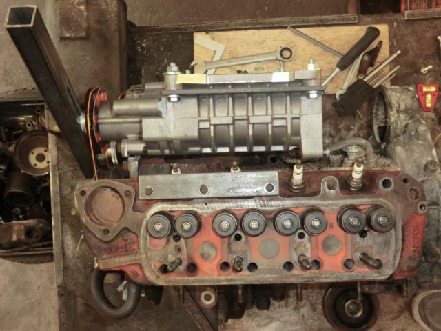 Bei der Auswahl eines geeigneten Verdichters habe ich mich aufgrund der guten Verfügbarkeit für einen Eaton Roots Verdichter entschieden. Das Bekannte M45 Modell aus diversen Mercedes-Modellen bzw. der ersten Generation des BMW Cooper s fördert mehr Volumen, ist jedoch nicht so kompakt wie der M24 aus dem VW Motor. Laut Druckverhältnis/Volumenstrom-Diagramm ist der Wirkungsgrad des M24 Modells dem M45 Verdichter überlegen. Die VW Motoren verfügen über eine spezielle Variante des Eaton M24 Kompressors mit integrierter Getriebestufe. Zu Beginn habe ich mir eine Vorrichtung aus einem 4-Kant Rohr gebaut, um eine geeignete Position für den Kompressor zu finden. Die orange Schnur stellt symbolisch einen vorläufigen Riemen-Verlauf dar. Das Konzept sieht einen Antriebsriemen für sämtliche Nebenaggregate vor.