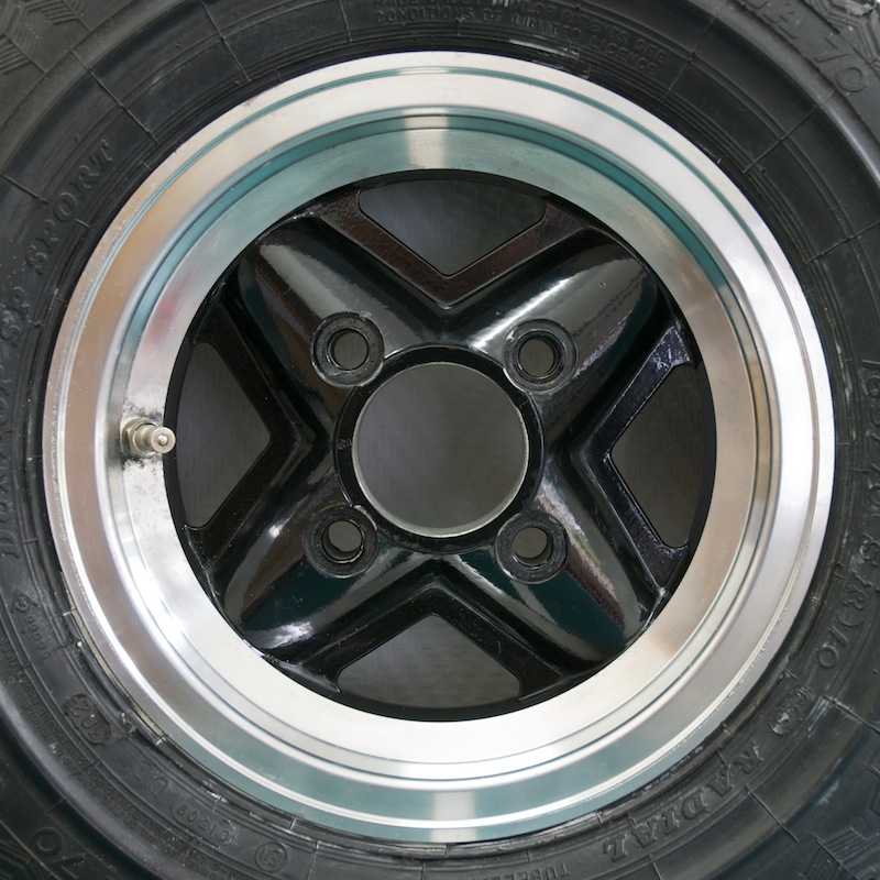 Die Felgen sind in einem guten aber nicht perfekten Zustand. Zwei Centre Caps fehlen. Die Reifen sind nicht mehr zu gebrauchen, daher ist hier auch nur die Rede von den Felgen.