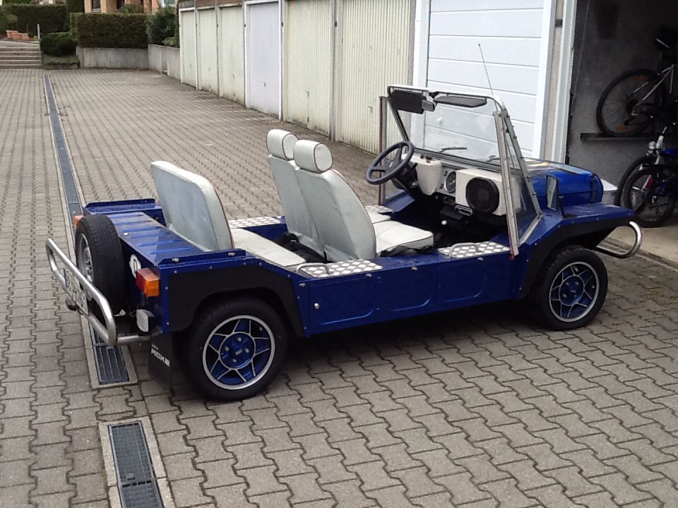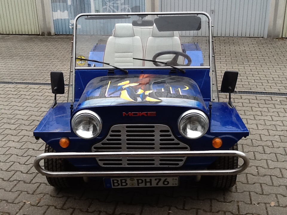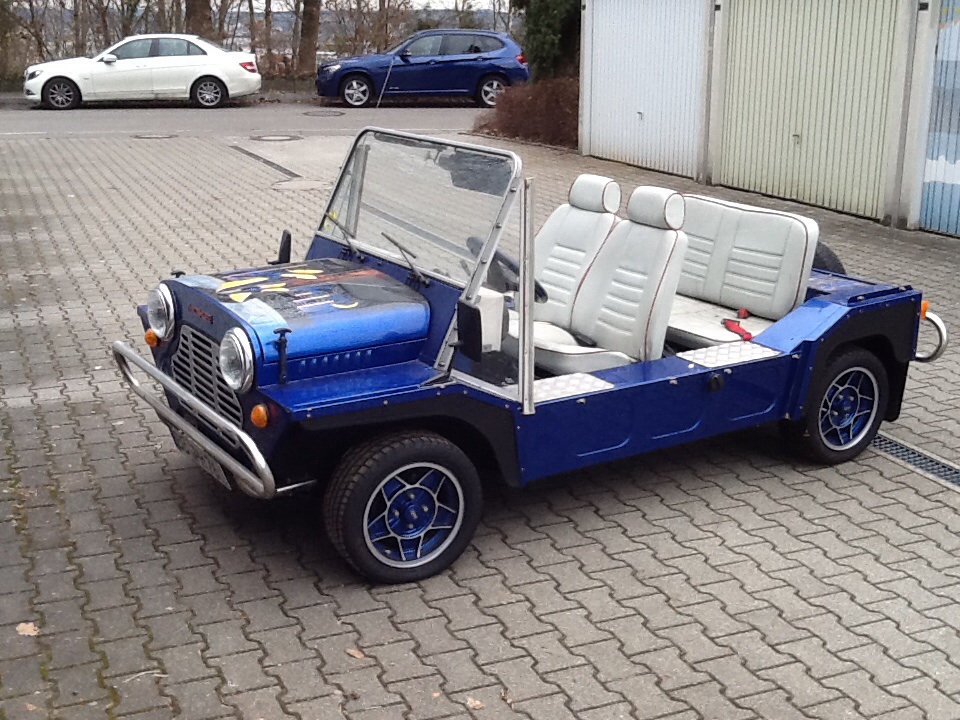 Mini Moke Bj. 88 gut erhalten und gepflegt, wurde gleich im ersten Jahr nach seinen Import komplett konserviert. Bin Autolackiermeister und es fehlte bei dieser Lackierung an nichts, Fahrzeug ist komplett mit Epoxyharz Füller lackiert worden und in einem Wunderbaren Blau Metallic lackiert. Airbrush auf der Haube ist auch selbst gemacht. Habe nur einen Halter angegeben da Erstbesitzer mein Vater war aus Versicherungtechnischen Gründen also zwei Halter aber in der Familie weitergegeben. Fahrzeug hat normale Gebrauchspuren und wurde nur im Sommer mit Saison Kennzeichen gefahren. Gebe ihn wegen Familienzuwachs schweren Herzens ab. Dem neuen Besitzer soll der Moke genauso viel Freude bereiten, wie mir. Radio und Lautsprecher sorgen für Angenehmen Musikgenuss auch bei Autobahnfahrten. Motor ist top in Schuß und TÜV und AU auf Wunsch neu gemacht. Fahrzeug kann in Woche 34 besichtigt werden. Sportauspuff mit 96 dB eingetragen. Habe auch noch einen Kat der noch nicht eingebaut worden ist, damit bekommt er dann auch ein Umweltplakette was sehr selten, und nicht mehr zubekommen ist. Mehr Bilder auf Anfrage. ATS Felgen in Wagenfarbe lackiert Reifen gerade mal 500 km gefahren.
