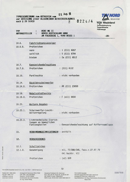 Ja, ich habe ja auch von Mini-Guido nochmal die Unterlagen bekommen. Die sind vom TÜV-Rheinland, Antragsteller ist Rover und gültig für die Betriebserlaubnis NR 8224/4 ...Im Neuen Schein steht bei mir nix unter K, aber im alten Brief steht genau diese ABE Nummer 8224/4...