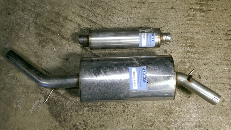 Es ist eine Bastuck Romi mit seitlichem Endrohr, verkauft werden Mittelschalldämpfer (Romi/S-1), Endschalldämpfer (ROMI/S-63S-S) und das Gutachten (blau).