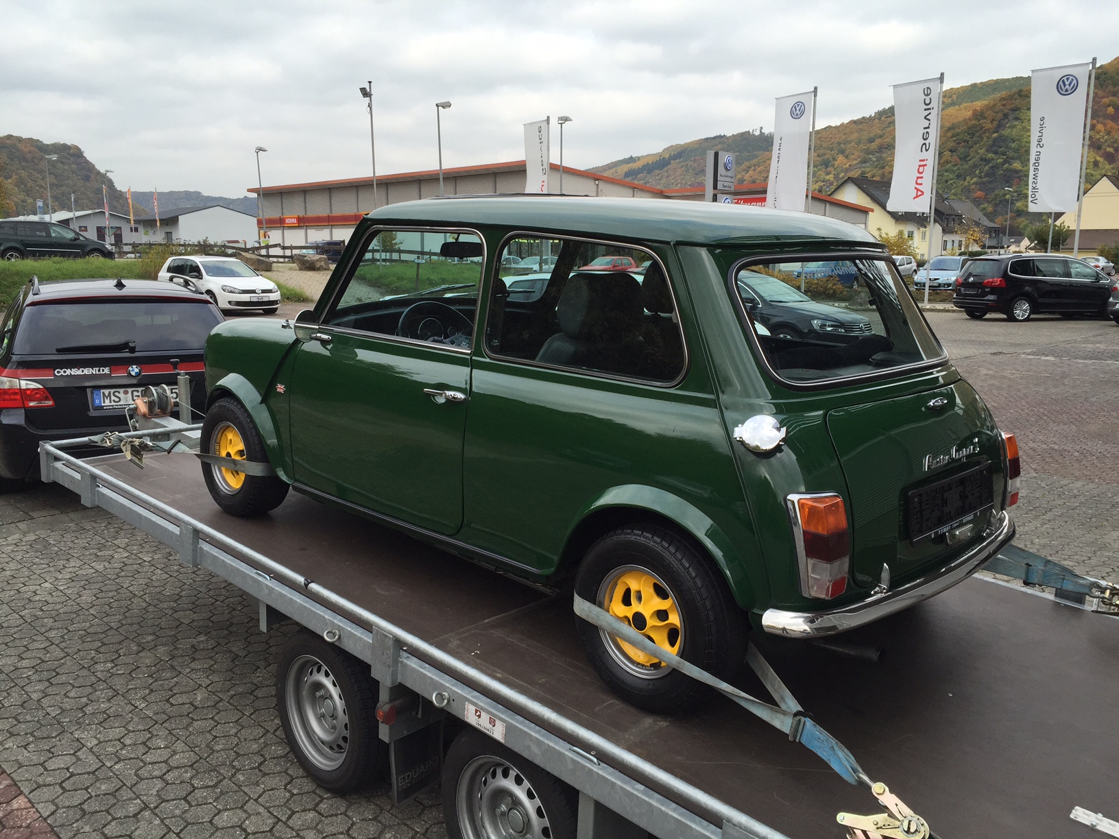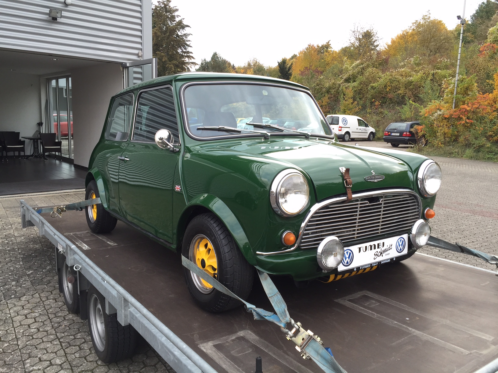 Ich habe meinen Mini vor rund 3 Monaten von einem VW-Händler (Tumbi-Schmidt) in Boppard bei Koblenz gekauft. Der Wagen hat die letzte Zulassung in 1998 in Bühl/Sinzheim bei einer Dame. Danach wurde er meines Wissens bei einem Opelbetrieb vom Chef (oder im Auftrag dessen) restauriert und auch aufgemöbelt. Aus einem 6/1985er anscheinend immer unigrünen 1000er wurde ein 1275er mit 10" und etlichen weiteren Umbauten die auch alle sauber eingetragen wurden (Peco-Auspuff und Wellerfelgen waren eingetragen aber zum Zeitpunkt des Kaufs waren ein RC40 und gelbe! Mille Miglias drauf). Im Innenraum wurde auf Tacho-Ei und Opel GTE Recaros umgerüstet.