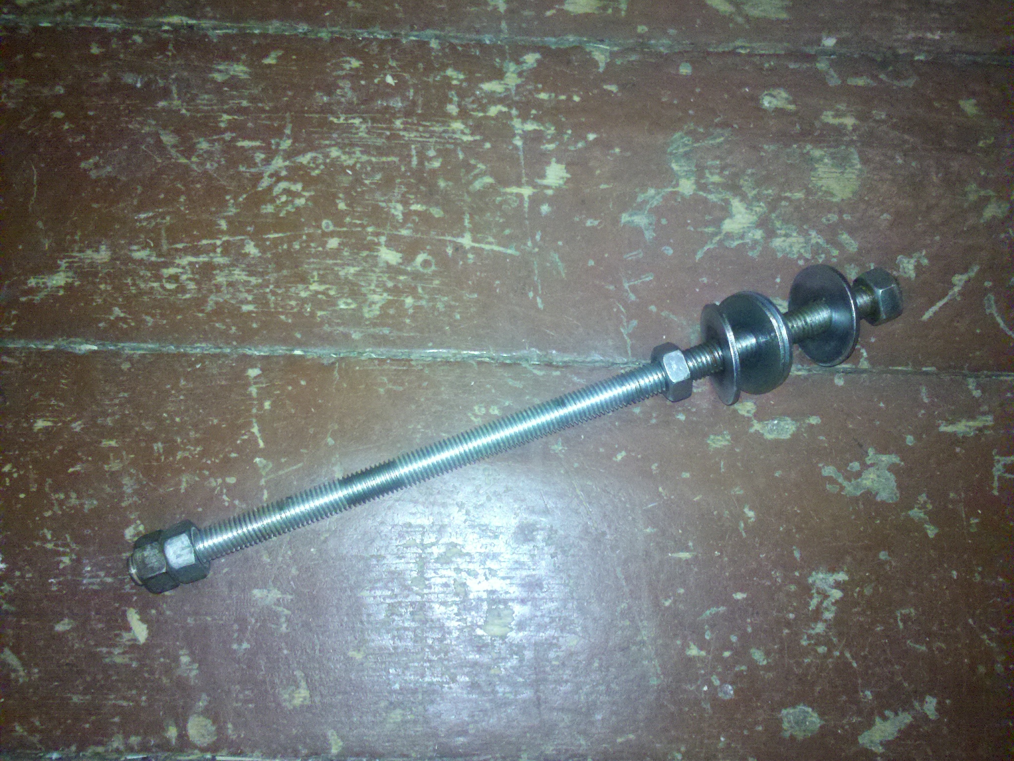 Auf dem Bild zu sehen ist ein Stück Gewindestange M14, ca. 330mm lang, ein paar Scheiben, ein paar Muttern.