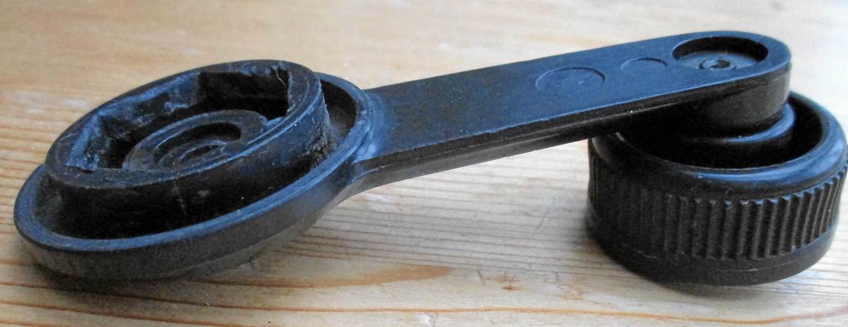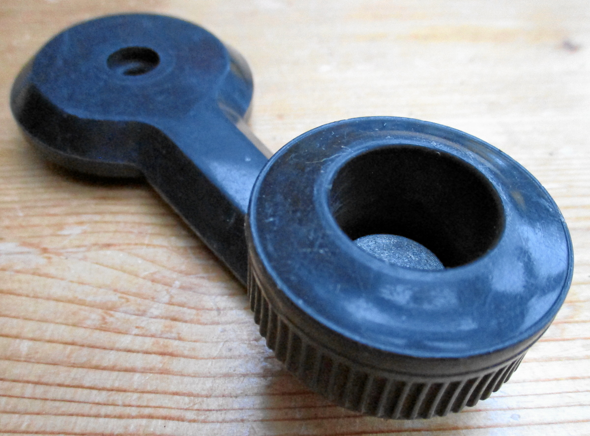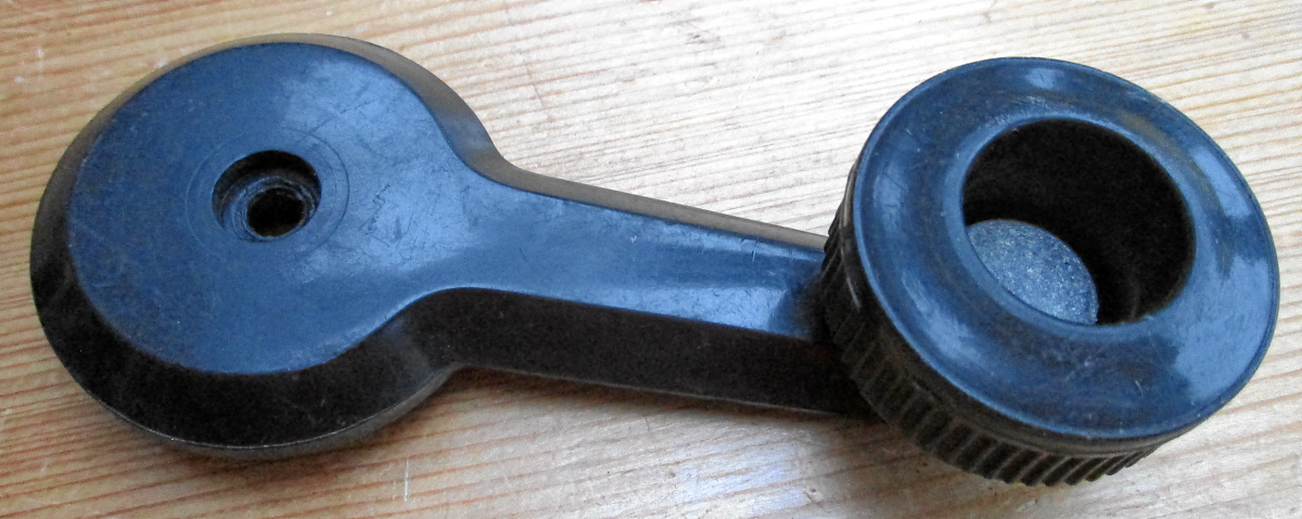Hier erstmal eine merkwürdige Fensterkurbel. Passt auf den Mini, aber welches Modell hatte solch eine seltsame Kurbel? Mit einen dicken, geriffelten Drehknopf und ganz tief innen liegender Metallkappe.
