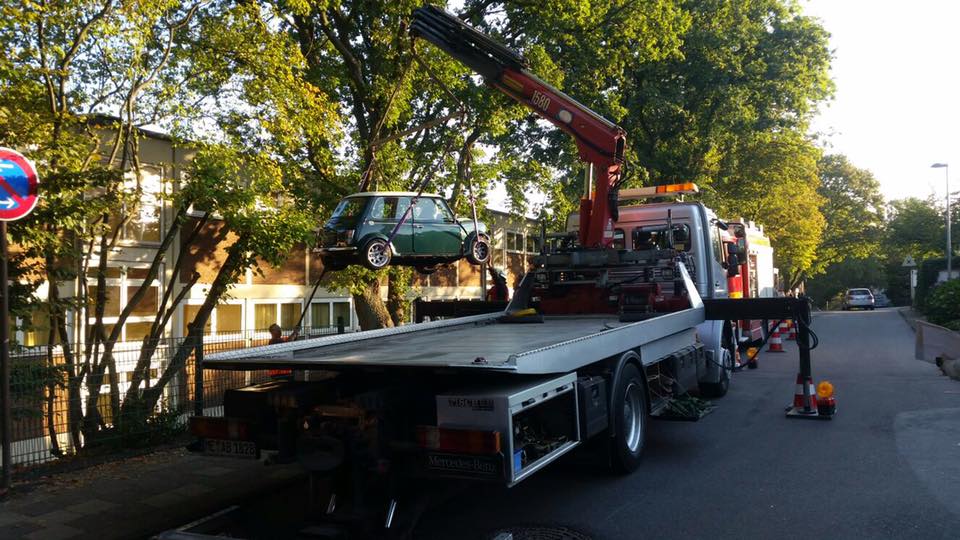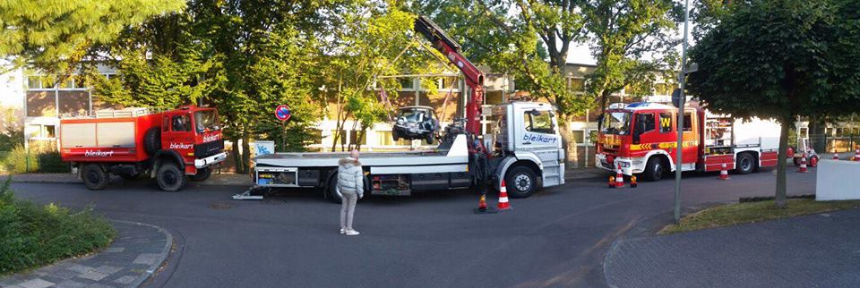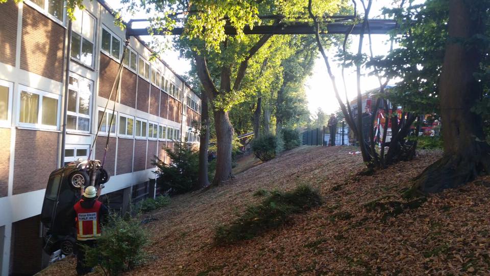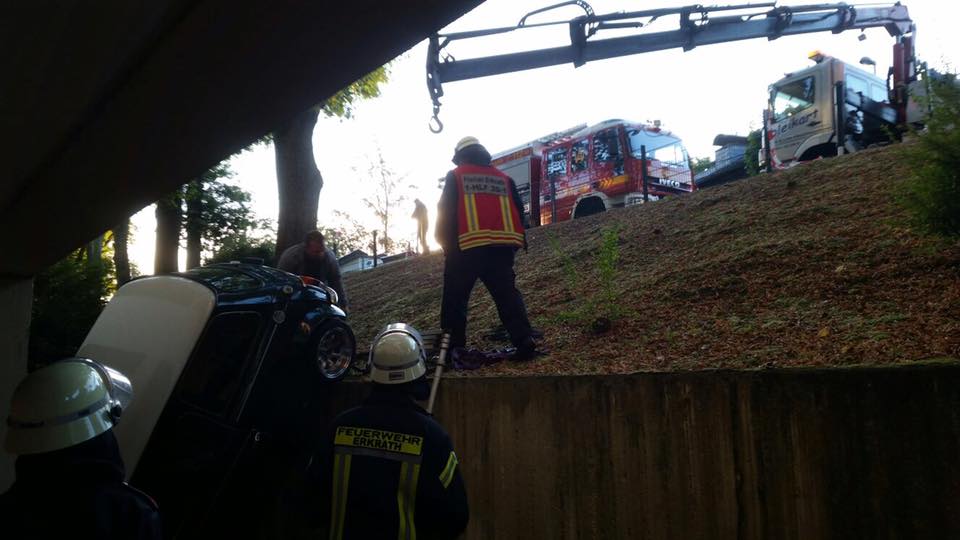 Aus bisher ungeklärter Ursache machte sich heute morgen ein Pkw auf der Wielandstraße selbstständig und rollte über die Hölderlinstraße hinweg, durchbrach einen Zaun und rollte den Abhang zur Johannesschule hinunter. Da am Anfang noch nicht feststand ob sich jemand im Fahrzeug befindet, wurde die hauptamtliche Wache mit einem Hilfeleistungslöschfahrzeug und einem Rettungswagen sowie der Notarzt der Feuerwehr Mettmann durch die Kreisleitstelle alarmiert.