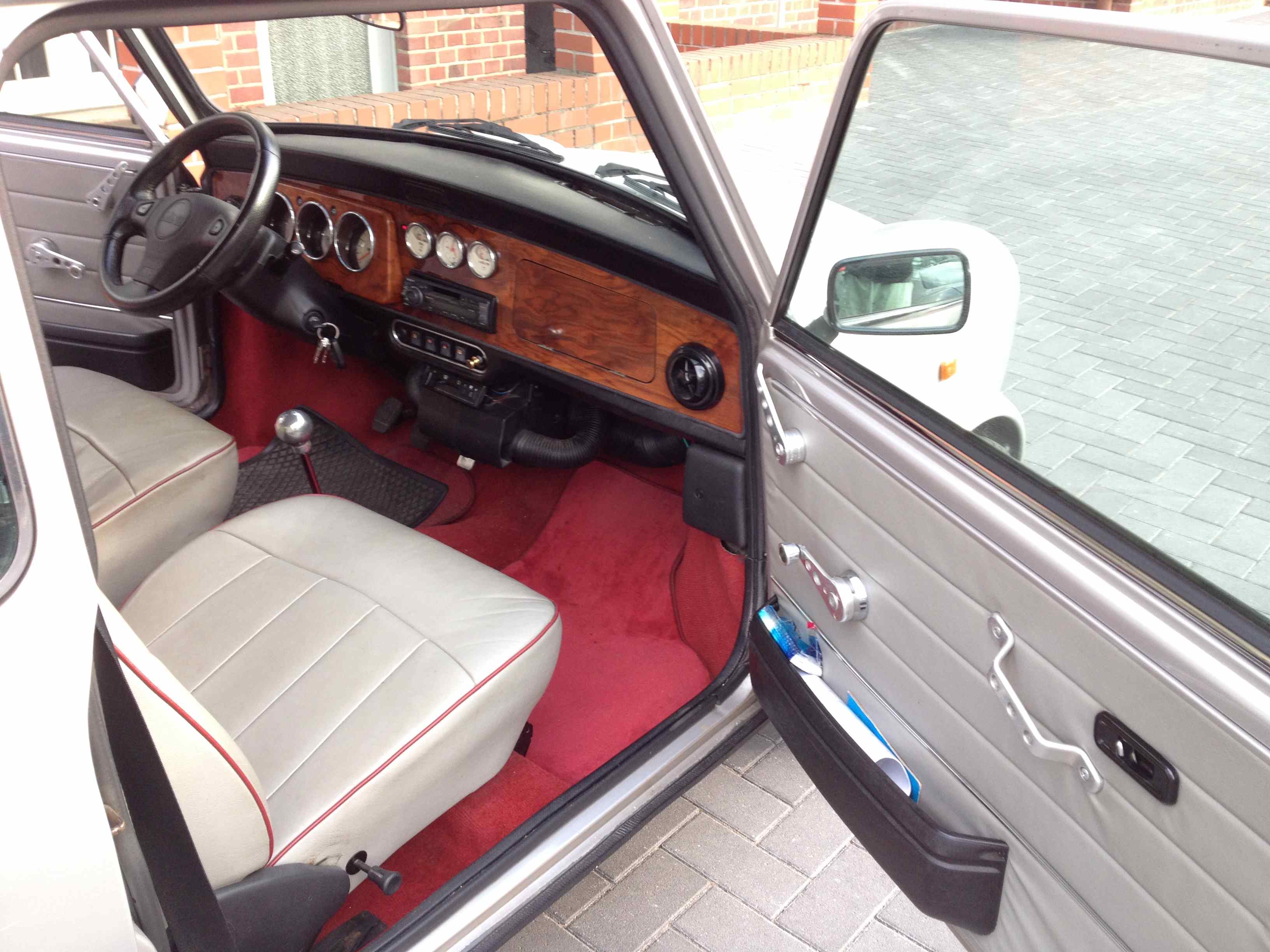 Beschreibung: Dieser Mini ist laut TÜV in einen sehr guten Zustand. Er ist seit 2002 in unserem Besitz und wurde seit 2010 mit Saisonkennzeichen 05/10 gefahren und steht tagsüber in einem Carport und nachts in einer Einzelgarage. Es sind Melber-Felgen 6J 13 H2, ET13, KBA 40651 mit 175/50-13 Dunlop SP Sport 2000 montiert. Die Volllederausstattung hat keine Risse oder Abschürfungen. Das Armaturenbrett ist in Wurzelholz. Er hat alle 5000 Km Ölwechsel bekommen. Die Vorderachse ist mit einer 4-Kolben-Bremsanlage ausgerüstet. Einen Sportauspuff hat er auch. Die Vorderachslager, der Kühler, Frontscheibendichtung und der Hauptbremszylinder wurden in der Vergangenheit getauscht. Das Fensterglas ist leicht grün getönt. Er wird jeden Tag ca. 9 Km (eine Strecke) gefahren, sodass der Motor warm wird, also keine Kurzstrecke. Der Ölverbrauch ist normal. Motor, Getriebe und Fahrwerk machen keine abnormalen Geräusche.