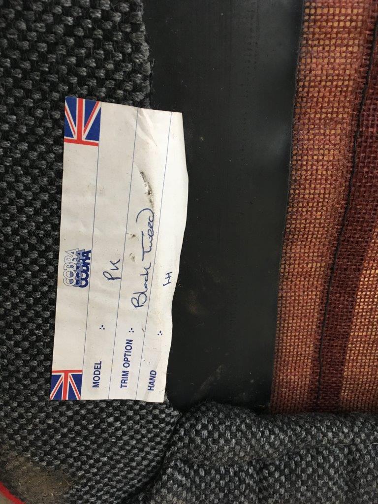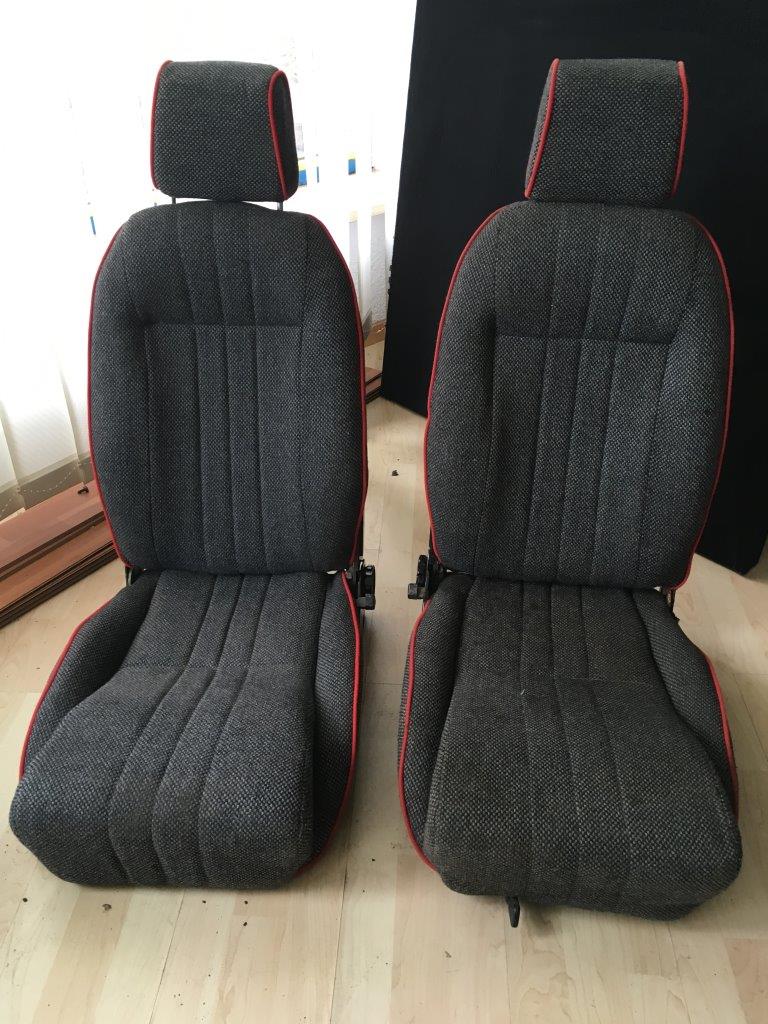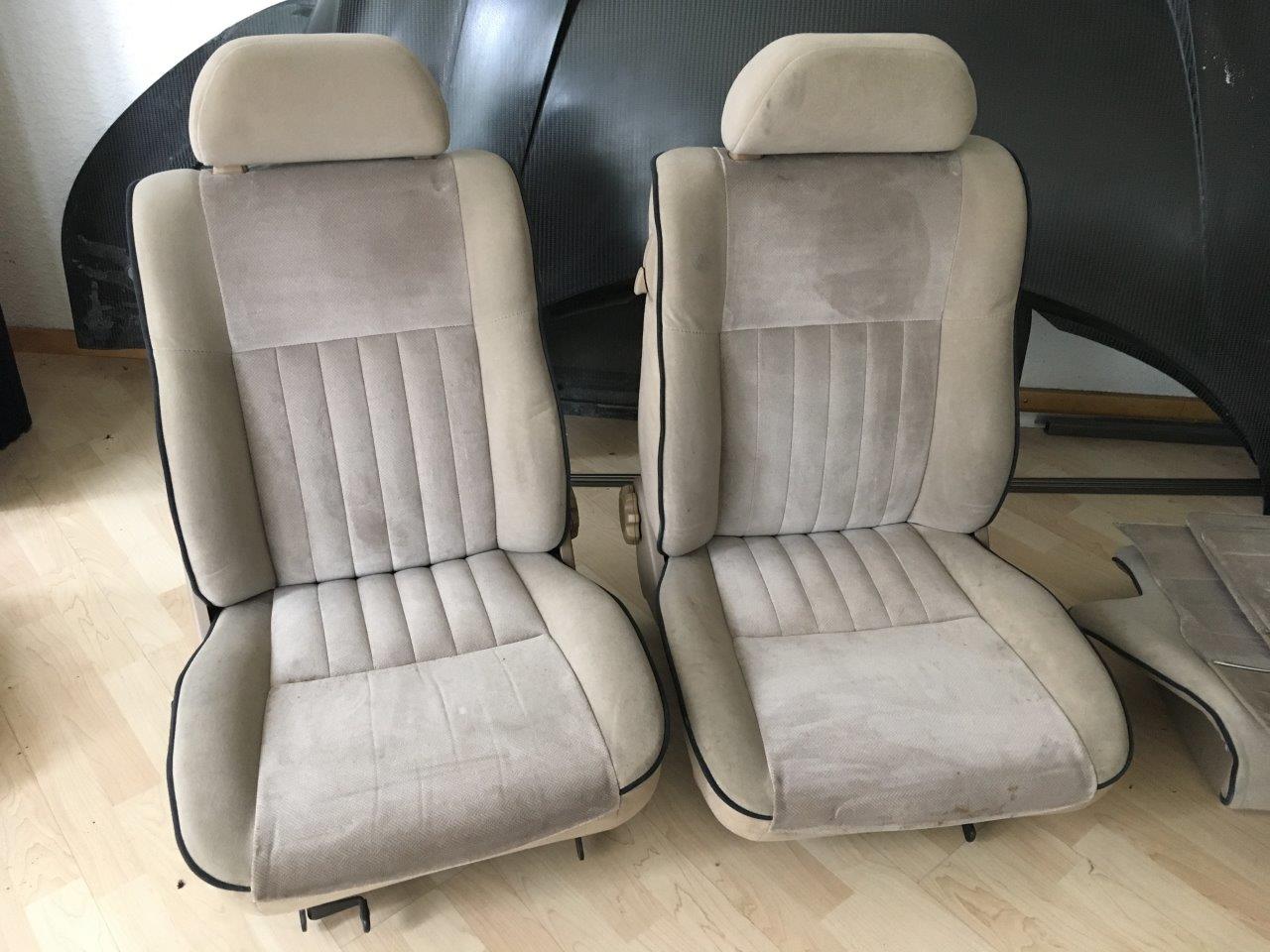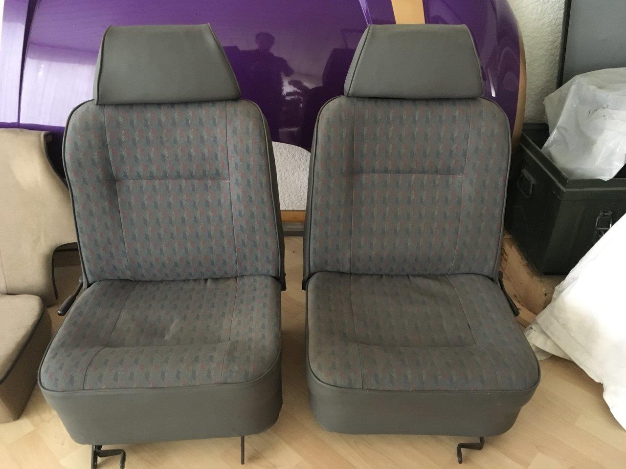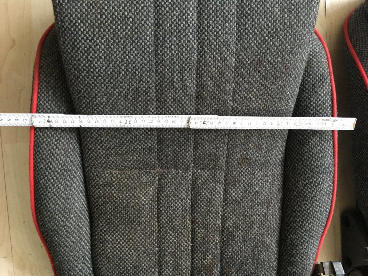 • Zwei Sitze unbekannter Herkunft, auf einem ist auf der Unterseite ein Zettel mit Cobra-Seats zu finden, es könnte sich also um einen Sitz aus deren Produktion handeln. Die Sitze sind für schlanke Personen bequem, sehr schmal, bieten aber trotzdem im Rückenbereich erstaunlich viel Seitenhalt. Der Fahrersitz hat einen Sitzschiene montiert und ist etwas dreckig (auch hier wird Polsterreiniger sicher gute Arbeit leisten), der Beifahrersitz ist quasi neuwertig.