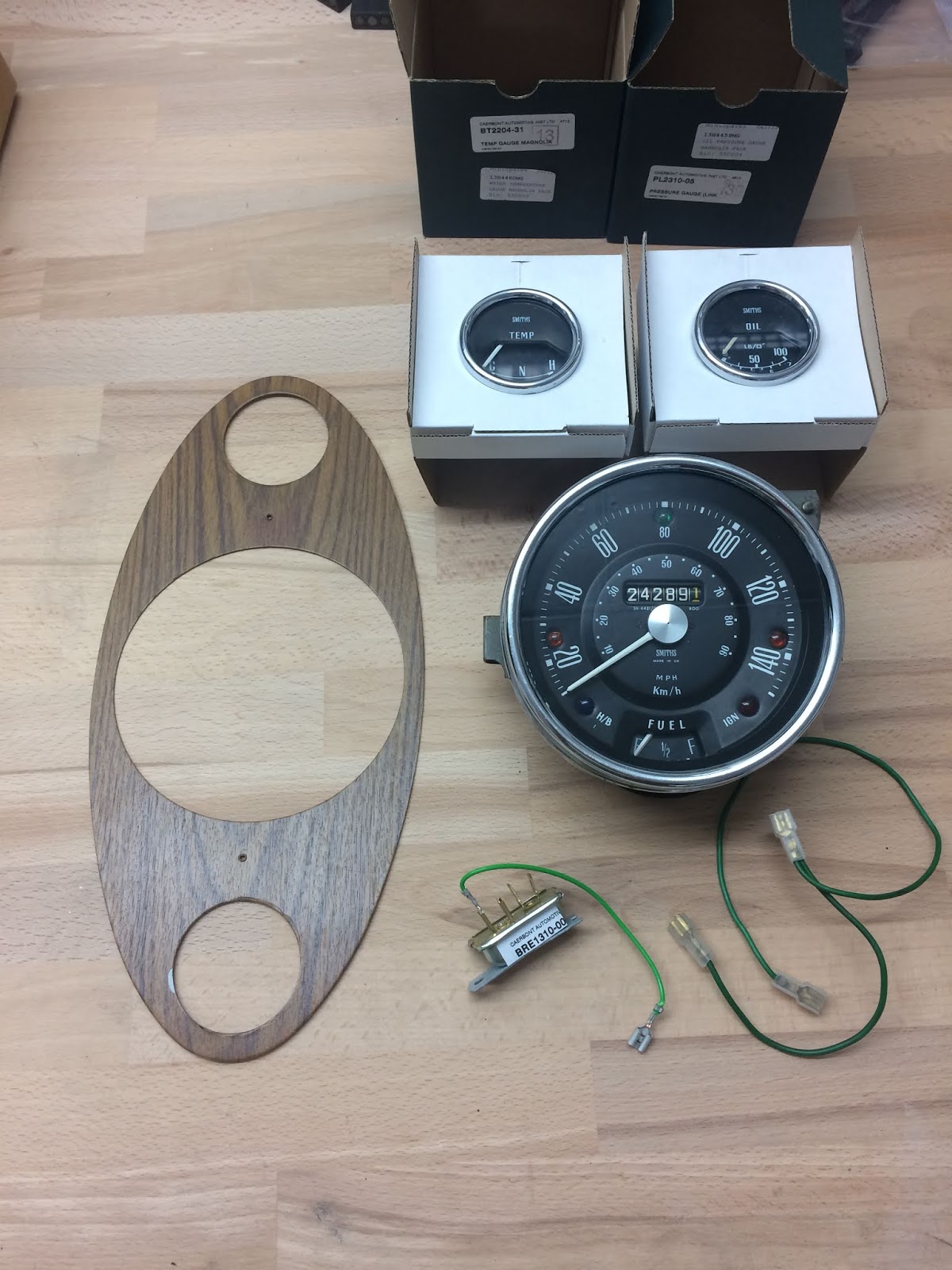 Verkaufe einen SMTIH Mitteltacho samt Öldruck-, Wassertemperaturinstrument, inklusive Spannungsregler und Holzdekor für Tachoei.