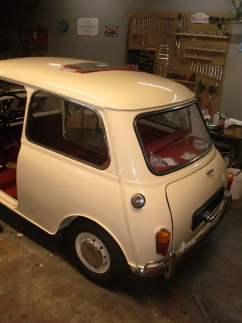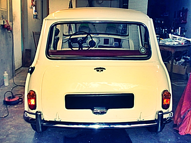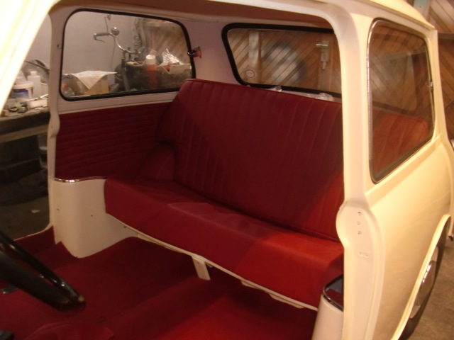 Das Befestigungsband für den Tank geht entlang der fetten Schweißfalz am Tank. Es verläuft gerade von vorne nach hinten, nicht diagoanl wie bei den späteren Minis. Außerdem ist es auf der äußeren Tankseite montiert. Es ist also kaum sichtbar im eingebauten Zustand, aber dennoch zugänglich zwischen Tank und Kofferraumausschnitt. Befestigt wird das Tankband an der Rückenlehne in dem oberen Loch ( oberhalb von dem aufgeschweißten Winkel). Dort ist eine eingeschweißte Mutter hinten dran. Am anderen Ende ist das Tankband direkt auf den Kofferraumboden geschraubt, ebenfall in ein Loch mit angeschweißter Mutter dahinter. Zumindest sofern bei der Erneuerung des Kofferraumbodens daran gedacht wurde diese zu installieren ![]()