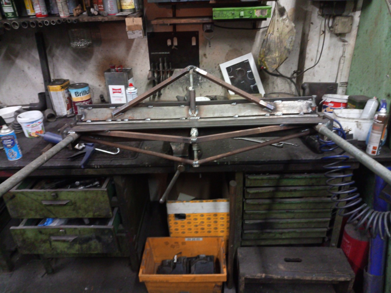 nachdem meine hinteren Seitenteile fertig sind, habe ich mir erst mal ein Größeres Abkantgerät gebastelt. Die bisher vorhandene kommt nicht ganz mit der Materialstärke vom Moke zurecht. Für kleinere Teile ging es Aber für die hinteren Kotflügel musste was anders her.Sieht wild aus aber erfüllt seinen Zweck.
