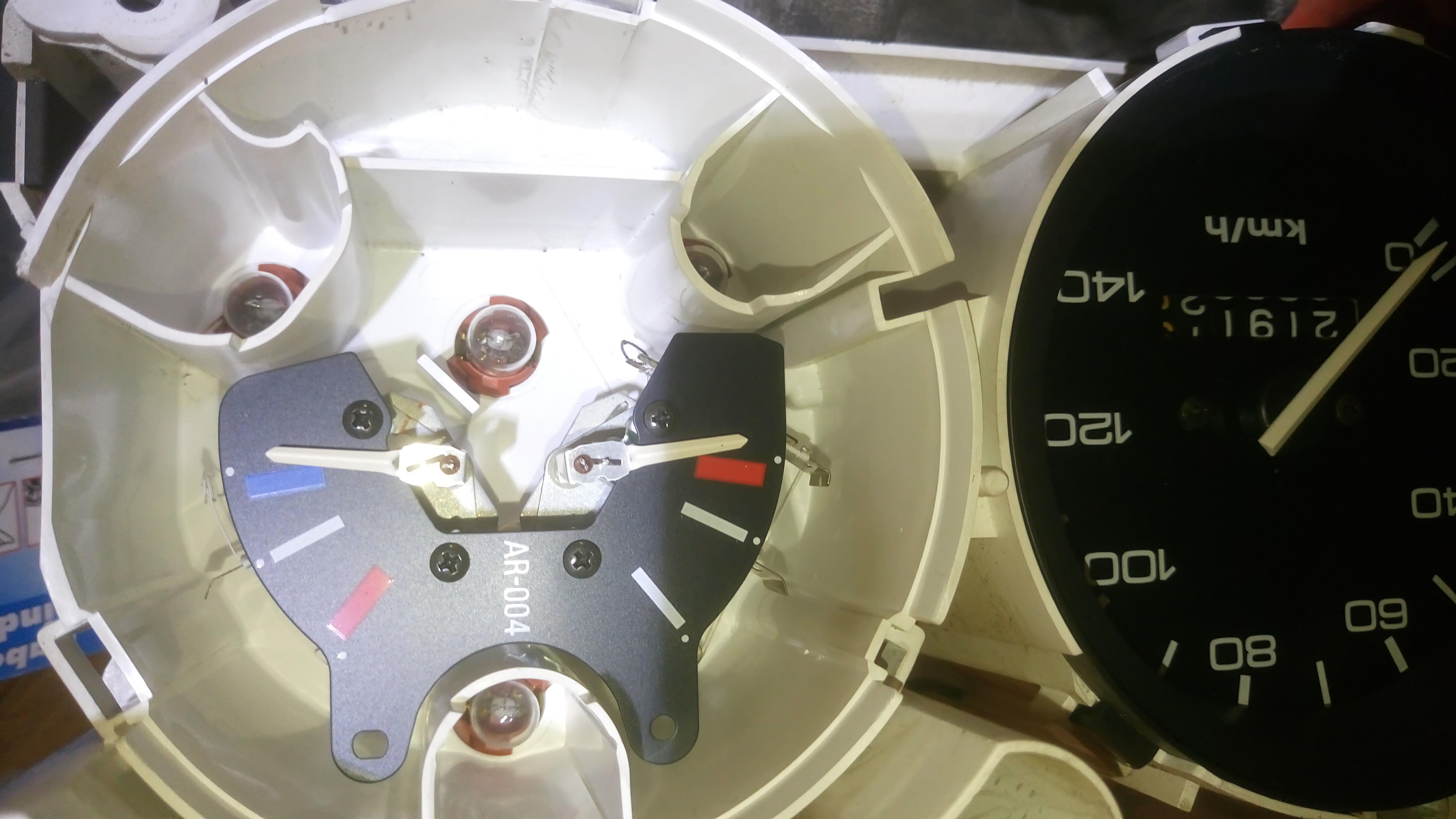 Wo wir beim nächste Problem sind. Bei einer anderen Tachoeinheit, habe ich gesehen, dass der Spannungskonstanter auf der Platine sitzt. Bei mir ist da nicht. Auch keine Stecker wo einer rein passen könnte. Ich habe das Teil mal zerlegt. Die Instrumente sind direkt mit der Platine verschraubt.
