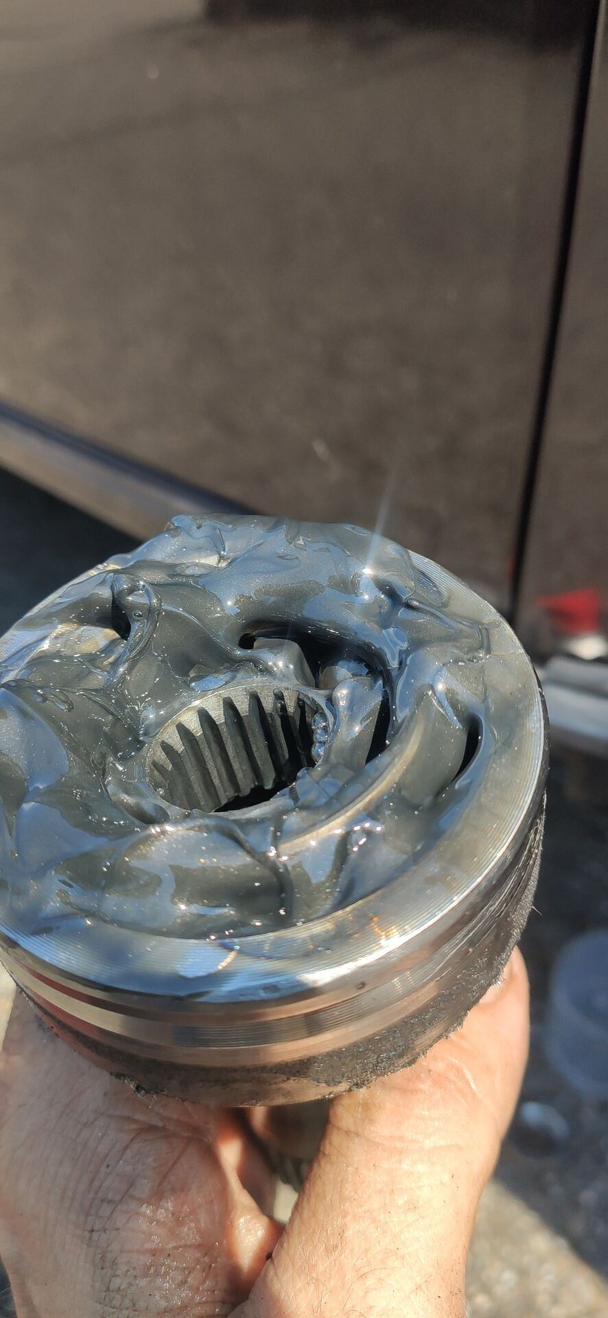 Das Fett war mal giftgrün, nun geiles Metallic. Allerdings hatte das Gelenk vor 5Tkm schon nen Schuss und das Fett wurde testweise mal reingemacht. Schmierig ist ja immer noch. Nur halt mit Flakes...