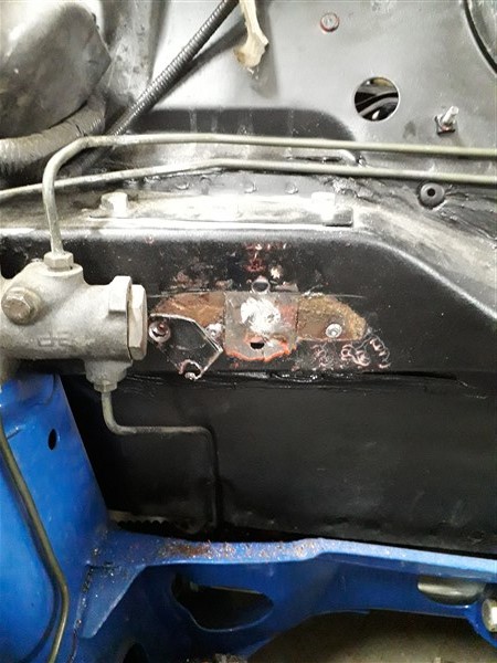 • Ein bisschen weiter gekommen: Nackenstützen hinten reingemacht (thread bei "Karosserie"), und im Motorraum aufgeräumt. Das Winkelblech für den oberen rechten Motorknochen brauch ich nicht, darunter ist eh' Dreck: