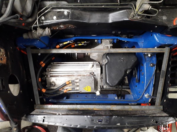 • Motor ist drin und auch die Antriebswellen "angeschlossen", (war schon vom Vorbesitzer gemacht). Der dicke Alu-Kasten ist der Regler, der muss als nächstes seinen Platz finden.