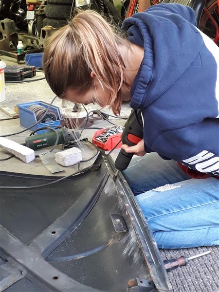 Der Fanghaken musste weg, sehr aufmersam! Bei der Gelegenheit ist auch die Kante vorne weggekommen, die gefiel meiner Tochter nicht (mir auch nicht). Dafür kann sie jetzt mit Bohrmaschine und Schweißpunktfräser umgehen.