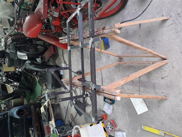 • Heute den Rahmen für den ganzen Krempel der nach vorne kommt fertiggeschweißt. Na ja, vorerst fertig; da kommen bestimmt noch Sachen dazu, hier ein Winkelchen, da eine Mutter....