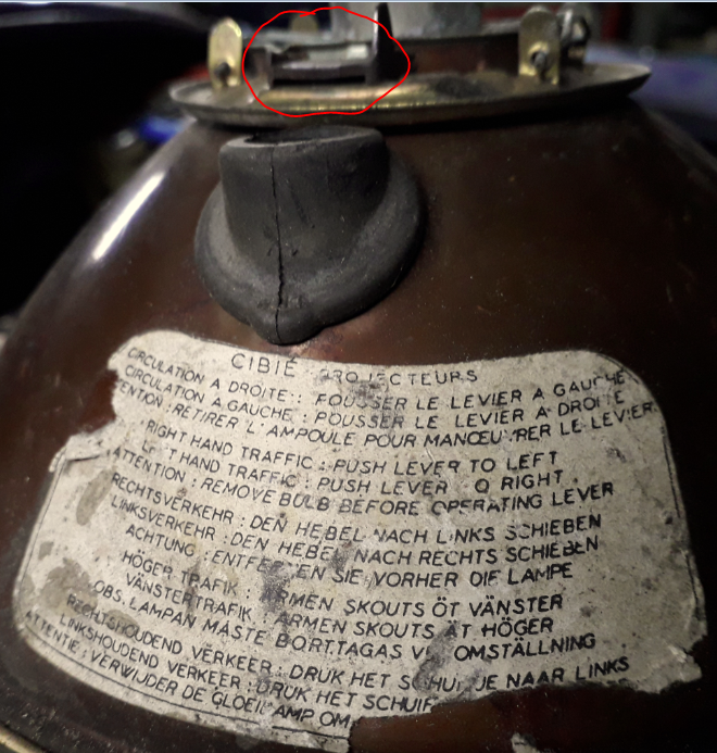 Mit "Hebel" ist der kleine Plastikschieber (roter Kringel, oben) gemeint, mit dem tatsächlich die Winkelstellung der Bilux-Scheinwerferbirne an Rechts- oder Linksverkehr angepasst werden kann.