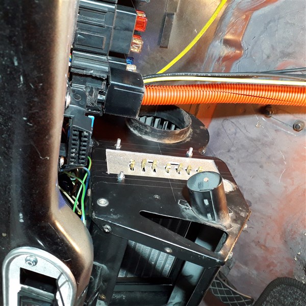 Allerdings ist es eine Frickelei, das Gehäuse an seinen Platz zu montieren, weil ein E-Auto hat ja ein ziemlich sperriges "Gas"-pedal, und das stört an der linken Seite der Heizung etwas. Da half nur, den linken Blechwinkel zur Befestigung der Heizung abzumachen und soweit wie möglich nach rechts verschoben wieder anzuschweißen. Die elend langen Gewindebolzen an der Heizung hab' ich gleich passend dazu gekürzt.