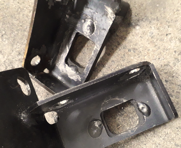 Die Löcher zur Befestigung am Hilfsrahmen hatte schon mal jemand mächtig bearbeitet, trotzdem ließen sie sich nur unter Zuhilfenahme eines Montiereisens nacheinander anschrauben, davon sind die auch nicht besser geworden. Weiterhin beachtlich (!) die fetten Schweißpunkte (damit sind die geriffelten Bleche von innen her festgemacht), wo eigentlich die Scheiben von der Schwingenlagerung plan aufliegen sollten. Die geriffelten Bleche selbst kollidierten dann auch noch vorne mit der Rahmenbefestigung an der Karosserie.