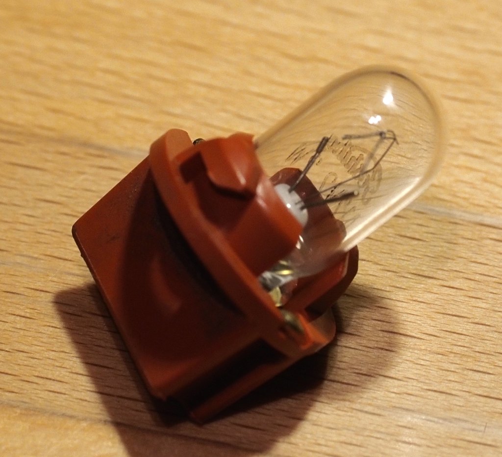 Das Armaturenbrett will ich ersetzen und habe es mit Hilfe der Anleitungen in diesem Forum ausgebaut. Dabei sollen natürlich dann auch ausgefallene Glühbirnchen ersetzt werden. Im Zubehörhandel werden Quetschsockellampen mit 2,1W dafür angeboten. Die Birnchen in meinem Armaturenbrett haben einen braunen Kunststoffbajonettsockel (siehe Foto). Lassen sich die Birnchen da einfach herausziehen oder sind die eingeklebt bzw. eingelötet? Wie krieg ich die Quetschsockellampen aus dem Bajonett?