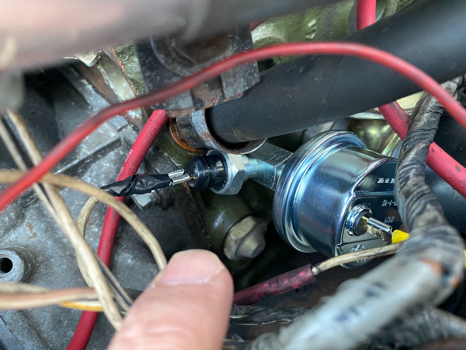 Hi PAB, das ist kein aktuelles Foto… mittlerweile ist auch der Kabelschuh mit Schrumpfschlauch isoliert. Problem an der Stelle ist aber der Platz und ich würde Öldruckgeber und -Schalter gerne an eine andere Stelle verlegen. Grüße
