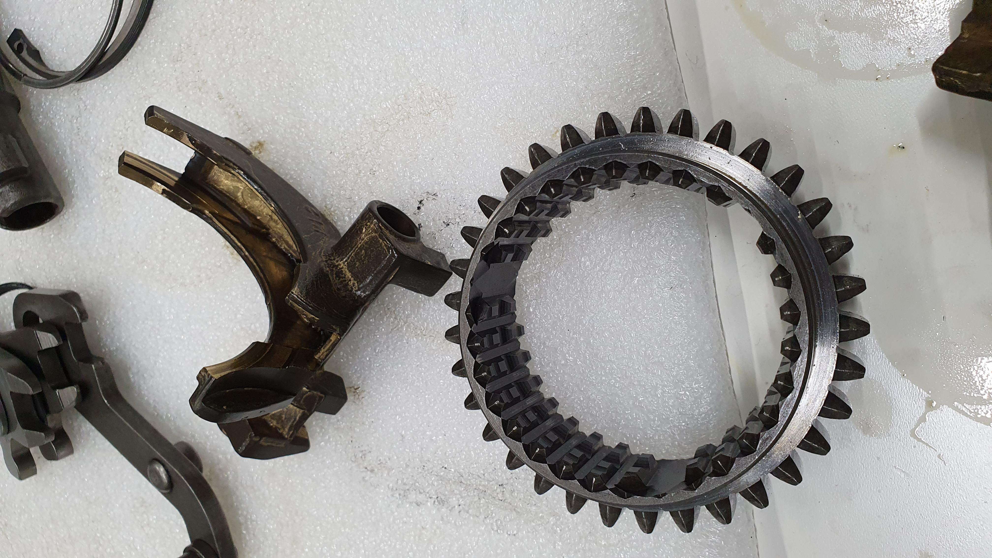 An dem Synchronring ganz unten sieht man eine blanke stelle rechts und links neben dem Zapfen. Kann das der vom 1st and 2nd gear sein und dort wegen der ausgeschlagenen Fork der nicht parallel rübergerutscht sein, sodass daher diese Spuren kommen?