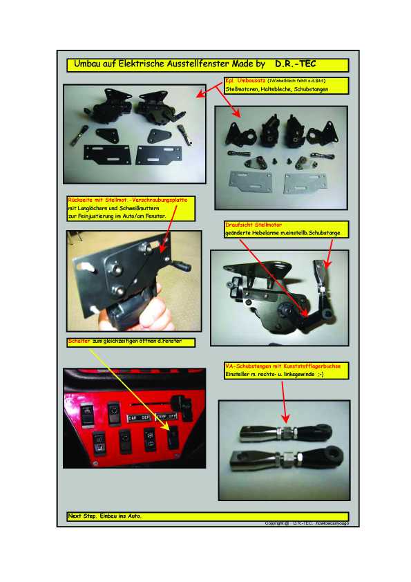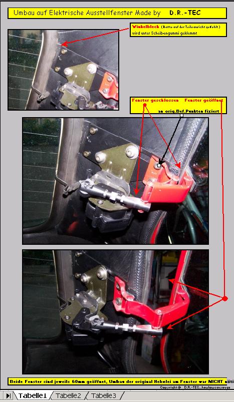 Was du brauchst sind Stellmotoren beidseitig aus dem Chrysler Voyager (irgendwas um Bj 2000) oder aus nem BMW 3er coupéDie Motoren der Voyagerstellhebel habe ich bei mir im Kofferraum verbaut (auch wegen des Stellgeräuchs) und die Stellhebel selbst an den C-Säulen verbraten.