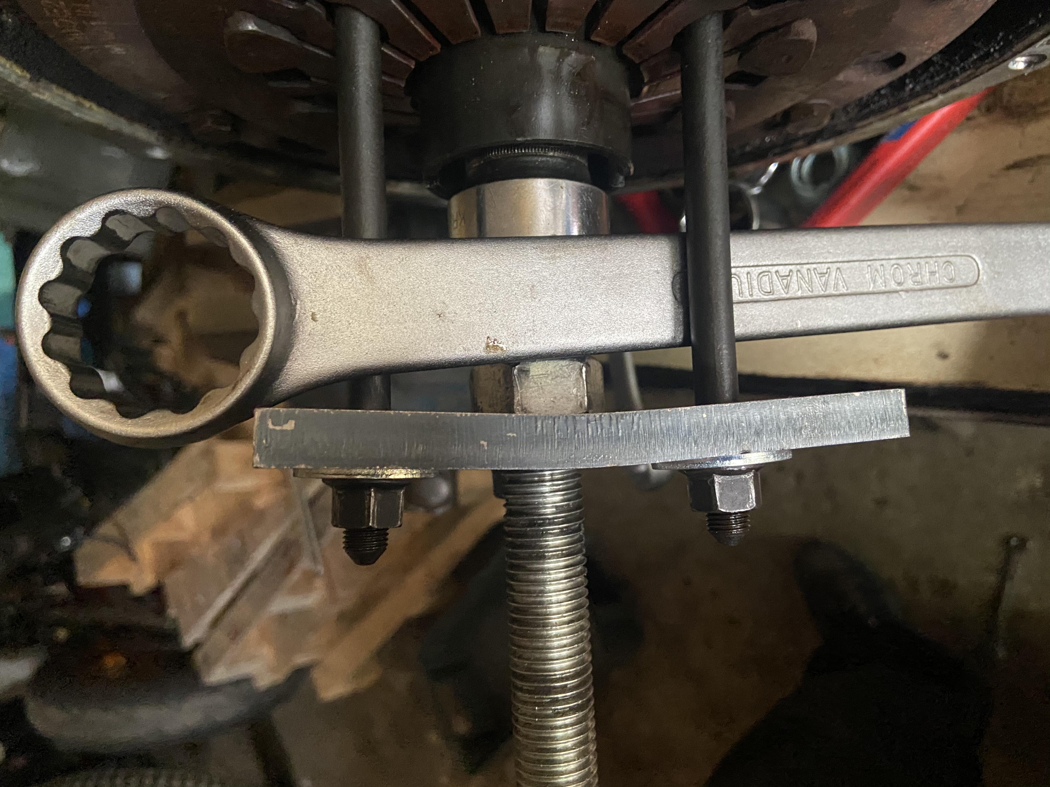 Ja die Scheibe habe ich entfernt. Das ist an der Stelle quasi alles frei. Der Abdrücker liegt schön auf dem Kurbelwellenstumpf auf.
