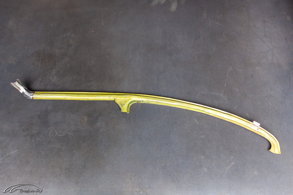 Als nächstes war die Verbindung zwischen der seitlichen Versteifung und der Versteifung oberhalb der Windschutzscheibe dran. Original ist das ein separates Eckstück, welches auf dem ersten Bild oben zu sehen ist. Die Schwierigkeit ist, dass durch das gechoppte Dach die Verbindung nicht nur um die Ecke geht, sondern jetzt auch einen Höhenunterschied ausgleichen muss. Ich habe erst versucht das alte Eckstück so zu modifzieren, dass es in die neue Form passt. Das hat aber absolut nicht geklappt. Also musste ich es neu bauen.