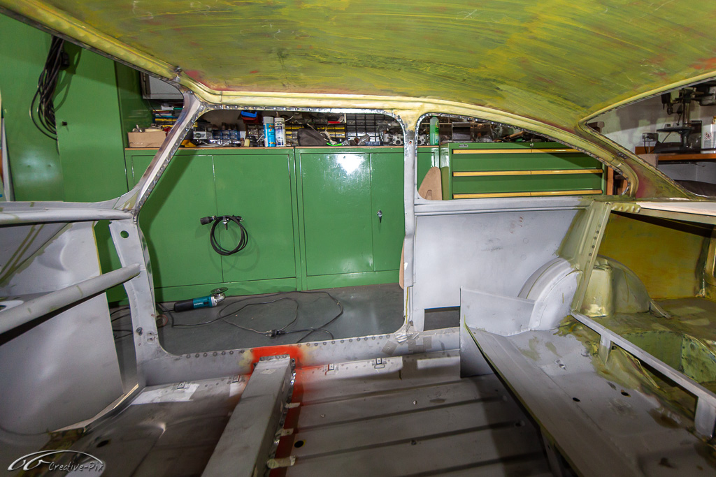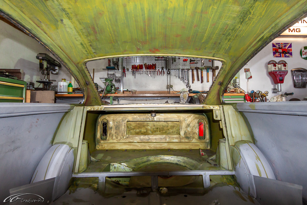 Nun ist aber mal wieder Zeit für ein Update. Nachdem nun das Dach inklusive aller Versteifungen fertig waren, kam der entscheidende Moment – Einbau der Heckscheibe. Die Frage war nicht, ob sie in den Ausschnitt passt, sondern ob der Flow mit der Dachlinie passt. Das war eines der wenigen Dinge, die ich nicht vorab errechnen oder ausprobieren konnte. Die Hinterkante der Dachhaut ist ohne Versteifung recht wabbelig und kann mal locker ein paar Zentimeter höher oder tiefer mit dem Versteifungsrahmen verschweißt werden. Aber, I’m a lucky boy. Der Flow über das Dach wird von der Heckscheibe sauber in einem Schwung weitergeführt. Wäre dort ein Knick im Übergang, wäre das Gesamtbild massiv gestört.