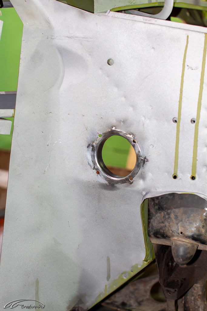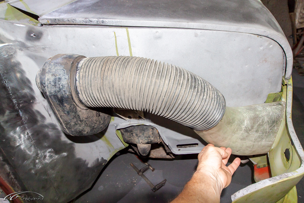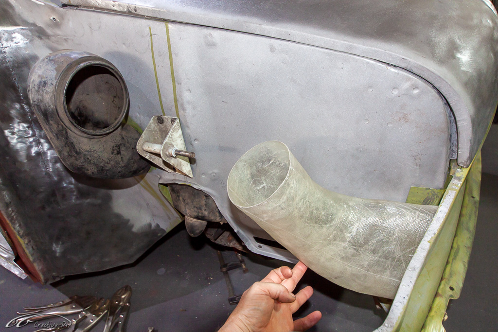 Nach ausgiebigen Betrachtungs-Sessions, gings dann weiter mit den Blecharbeiten. Bei den frühen Minis wird die Frischluftzufuhr für die Heizung mit einem Schlauch durch den Motorraum erreicht. Und der stört irgendwie immer. Bei späteren Minis wurde die Frischluftzufuhr durch den Radkasten umgesetzt. Eigentlich clever, wenn nicht kurz vor der Frontmaske die Zufuhr doch noch in den Motorraum umgelenkt wird, um dann soch wieder hinter dem Kühlergrill die Luft einzusammeln. Auch das Plastik Knie nimmt massiv Platz weg. Also habe ich die Luftzufuhr in der Broadspeed Karosserie, wie schon bei meinen früheren Restaurationen, wieder komplett in den Radkasten verlegt. Dafür musste ich erst mal den seitlichen Ausgang in den Radkasten bauen.