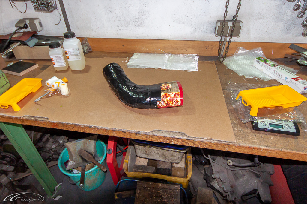 Nun galt es den passenden Luftsammler anzufertigen, der in den Frischluftschlauch mündet. Diesen habe ich aus GFK gebaut. Aus Zeitungspapier und viel Klebeband habe ich die Form gebaut.
