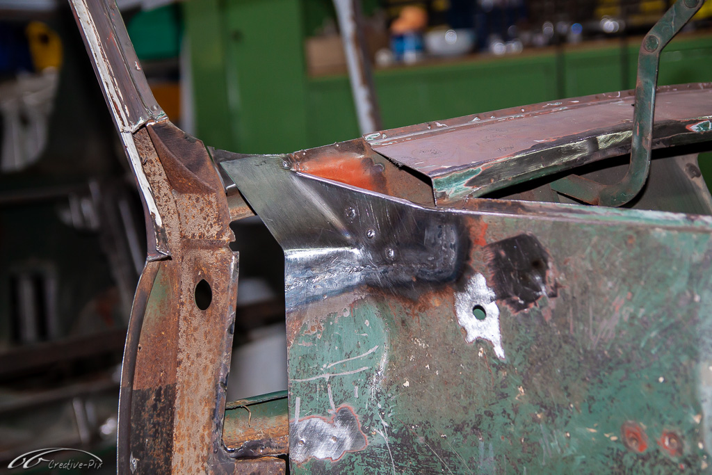 Um die Stabilität der B-Säule trotz der Schnitte und Schweißnähte nicht zu reduzieren, habe ich die B-Säule versetzt aufgeschnitten. Auf der Innenseite über der Gurtbefestigung und auf der Außenseite darunter. Ein weiterer Vorteil ist dabei, dass das Zusammenfügen der einzelnen Teile später deutlich einfacher ist. Wegen des gechoppten Dachs, muss auch der Windschutzscheibenrahmen etwas gekippt werden. Ein kleiner Schnitt im unteren Bereich der A-Säule langt dafür völlig.