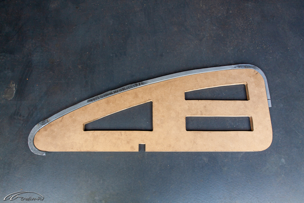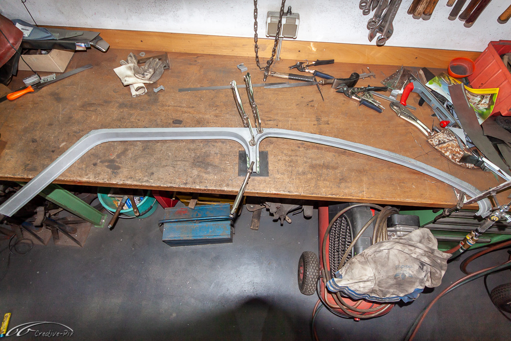 Um die Rahmen in die passende Form zu bringen habe ich ein Paar Schablonen gebaut. Mit dem Stauch /Streckwerkzeug habe ich die Rahmen nur umgeformt. Der hintere Radius ist deutlich kleiner als normal und musste separat angepasst werden. Beide Teile wieder miteinander verschweißt, passen sie ziemlich gut um die Schablone. Dass das klappt und auch von der Länge her passt, hätte ich zuvor selber nicht erwartet.