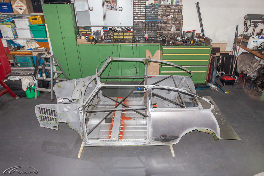 Nun gibt’s kein Zurück mehr. Nach 5 Trennscheiben war das Dach und das Heckteil ab. Das Dach wird weiter verwendet und bekommt eine neue Form. Das komplette Heckblech kann für einen anderen Mini weiter verwendet werden. Ich habe es so rausgeschnitten, dass alle Falze intakt sind.