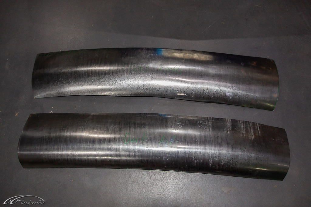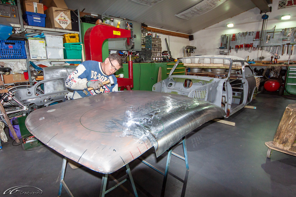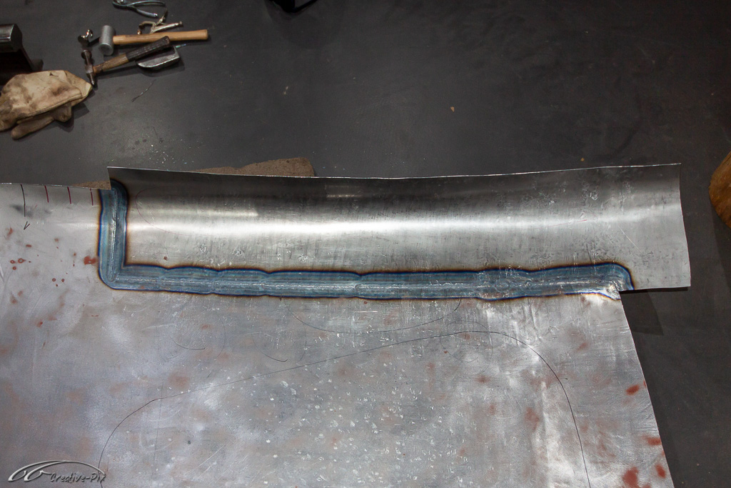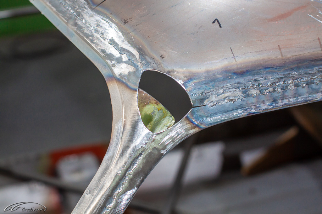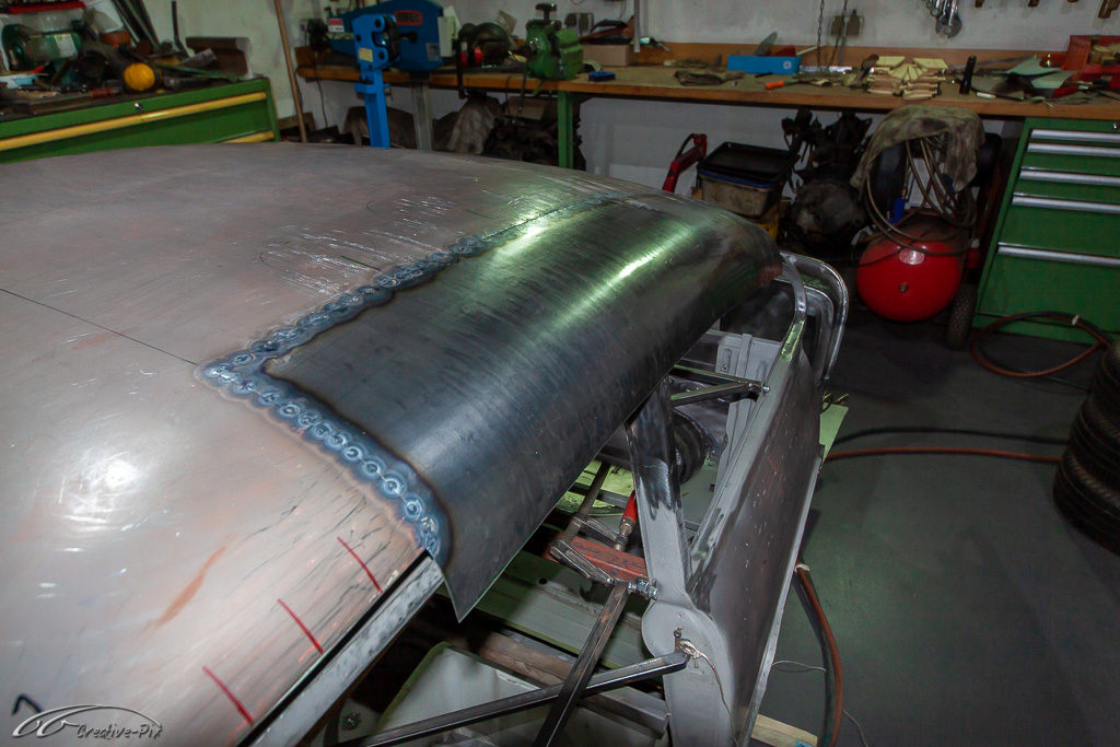 • Und auch die andere Seite will geschweißt werden. Die Dachhaut wird aber zunehmend schwieriger zu handhaben, je größer sie wird. Um eine möglichst glatte Oberfläche zu bekommen, habe ich sie aber dennoch diverse Male im English Wheel gerollt. Am Ende waren nur noch einzelne Stellen mit dem Glätthammer und Fäustel nachzubearbeiten.
