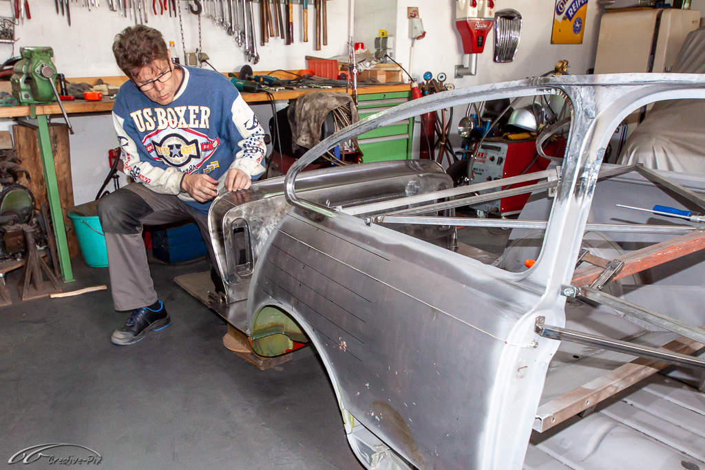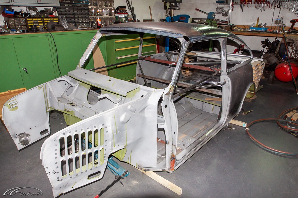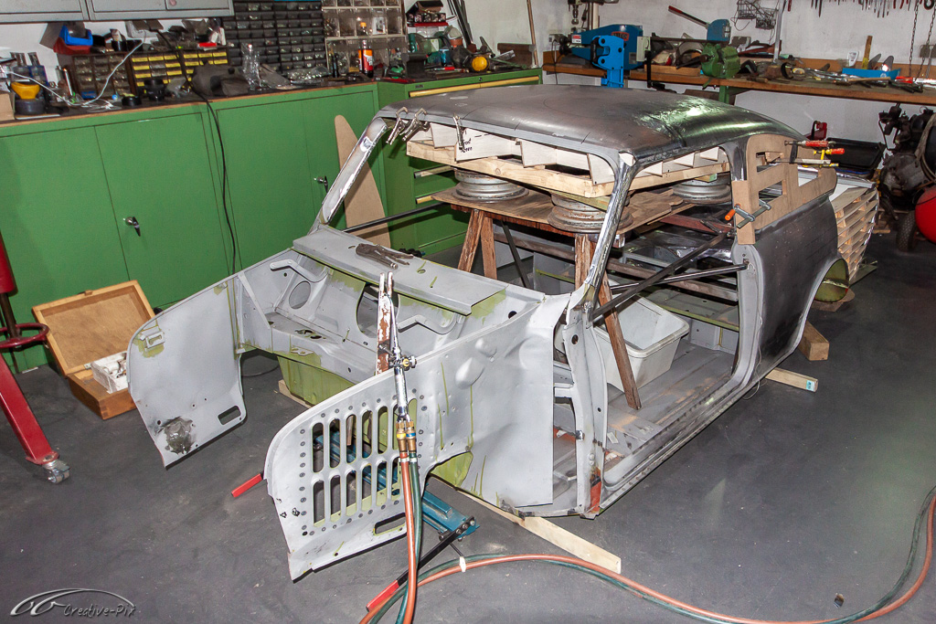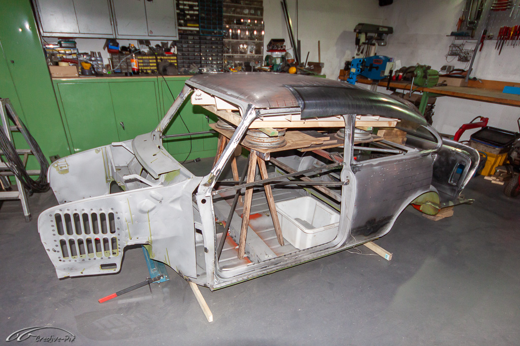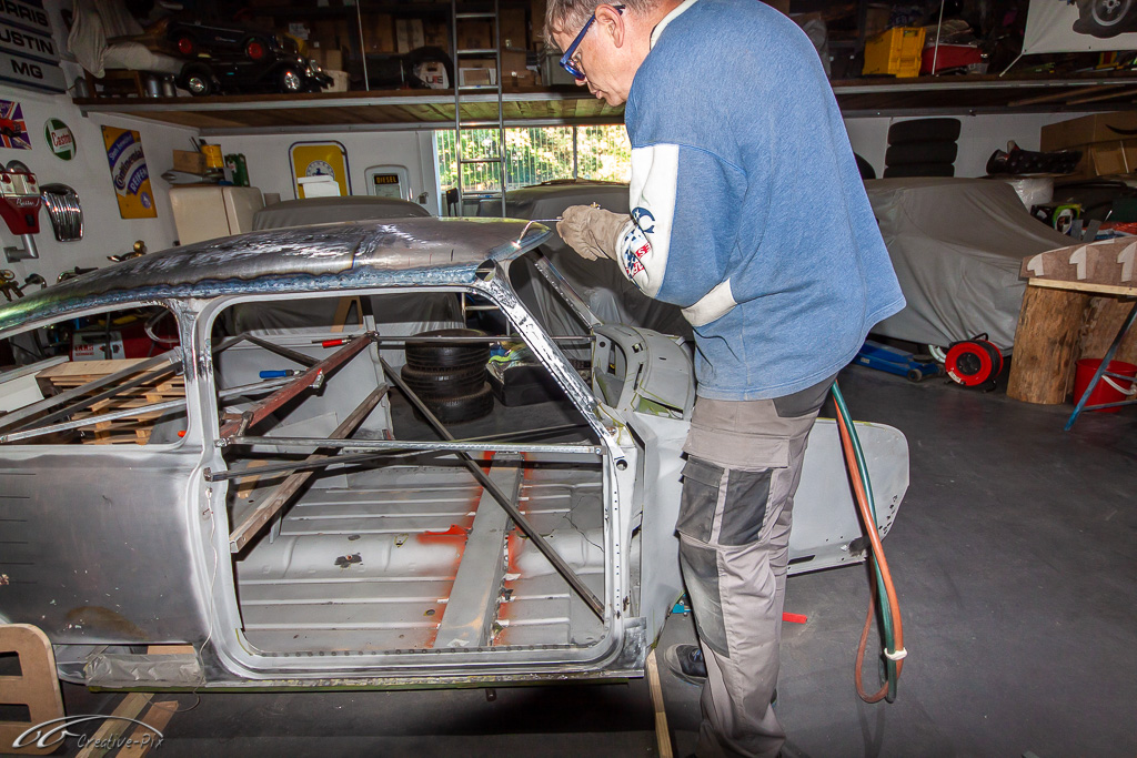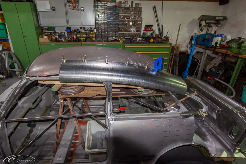 Im ersten Durchgang habe ich die Dachhaut rundherum nur geheftet. Angefangen habe ich mittig der Frontscheibe und habe mich dann Schrittweise nach links und recht vorgearbeitet, weiter über die Seiten, bis das Dach komplett mit der Karosserie verbunden war. Das hat bereits einige Stunden gedauert, da es ein ständiger Wechsel zwischen heften, richten, heften und richten war. Zwischendrin habe ich daher keine Fotos gemacht.