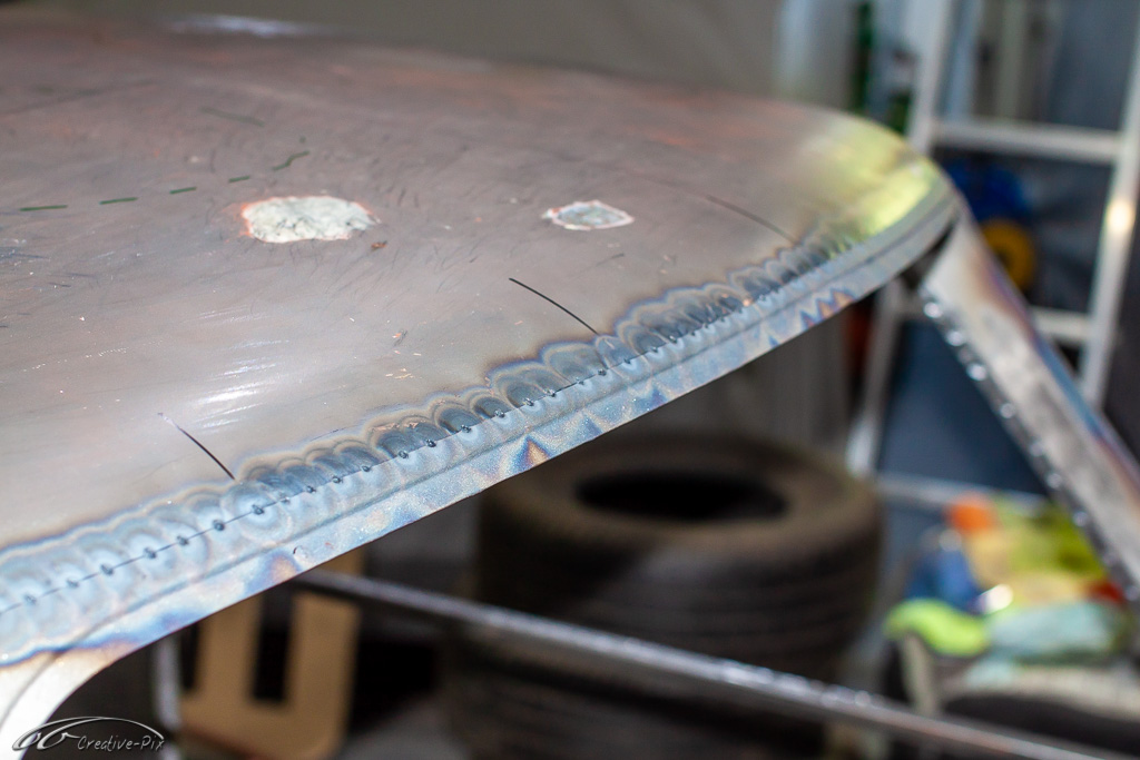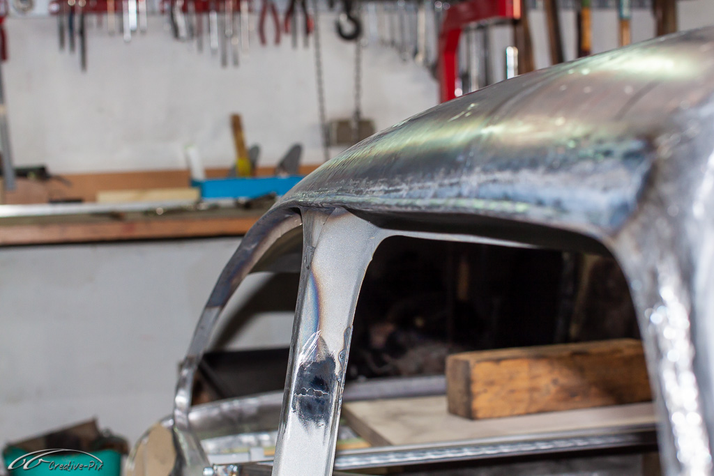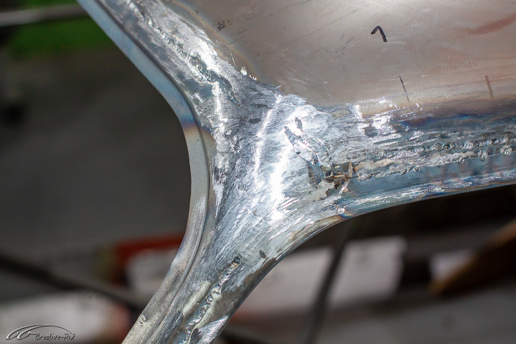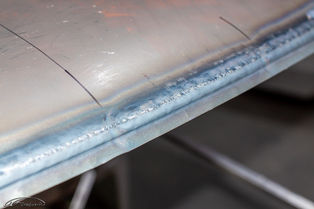 Da es ziemlich schwierig ist drei unterschiedlich gekrümmte Bleche miteinander zu vereinen und dabei eine saubere Dachecke zu formen, habe ich die Ecke einfach ausgeschnitten. Dann habe ich ein Füllblech in der gewünschten Wölbung angefertigt und sauber eingepasst. Die habe ich dann mit Schutzgas eingeschweißt. Die Entscheidung habe ich aber schnell bereut, da ich mehrmals nachschweißen musste. Entweder habe ich die Naht durchgeschliffen, während ich versucht habe eine gleichmäßige Rundung zu erstellen, oder die Schweißpunkte saßen nicht sauber aneinander. Hätte ich das autogen geschweißt, wäre es deutlich einfacher gewesen den Bereich zu formen, zumal die Ecke von hinten viel besser zugänglich war, als vorher vermutet.