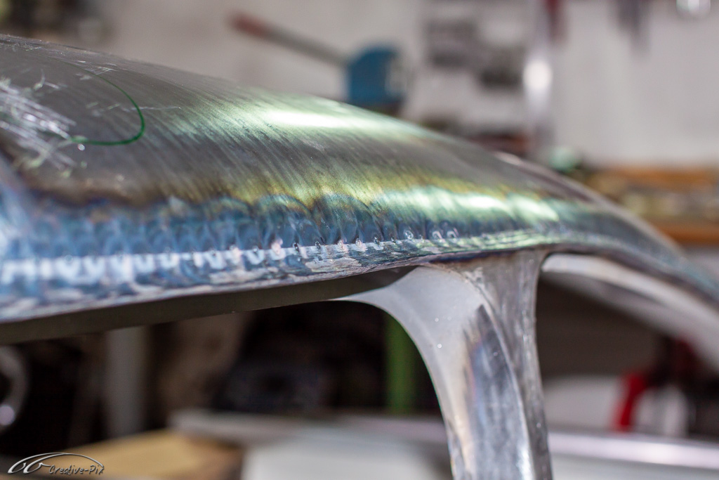 • Im zweiten Durchgang habe ich dann alles durchgeschweißt. Auch hier habe ich wieder in der Mitte der Frontscheibe angefangen. Glücklicherweise war danach garnicht viel zu glätten. Und so hat dann die Schweißnaht direkt nach dem Schweißen ausgesehen. Später bin ich lediglich mit der Drahtbürste bzw. dem Negerkeks darüber gegangen, um die Schlackereste und Anlauffarben zu entfernen.