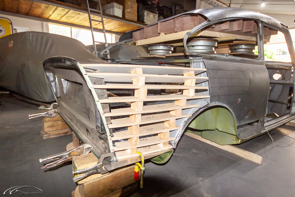• Zeitgleich mit der Dachhaut habe ich mich auch um die Heckpartie gekümmert. Dem einen oder anderen fällt vielleicht das fehlende Dach auf den Fotos auf. Als erstes musste ich die richtig Position vom Heckblech finden. Zum regelmäßigen Nachkontrollieren des Abstands habe ich an jeder B-Säule eine Strippe befestigt. Diese habe ich mit roten Farbpunkten versehen, die das exakte Maß hatten. So brauchte ich immer nur die Strippe auf Spannung zu halten und an das Heckblech zu legen, um zu überprüfen, ob die rote Markierung mit der Hinterkante übereinstimmt.
