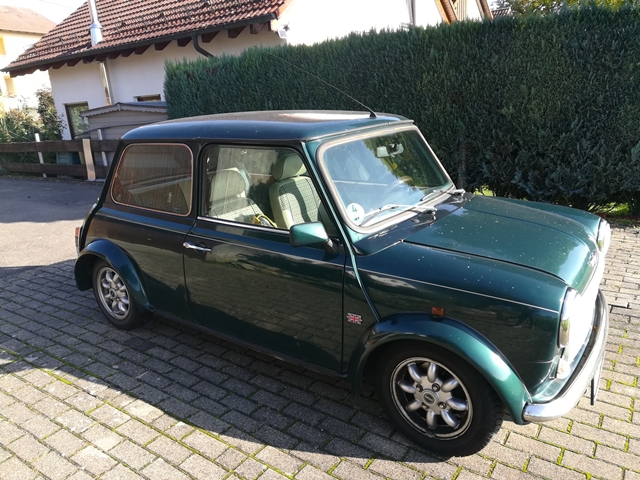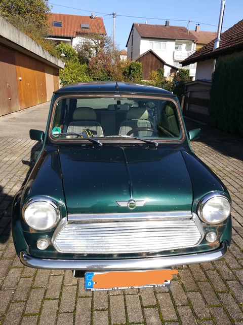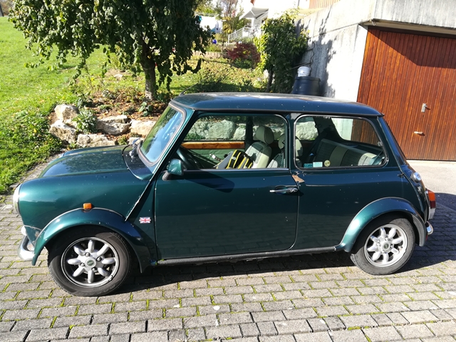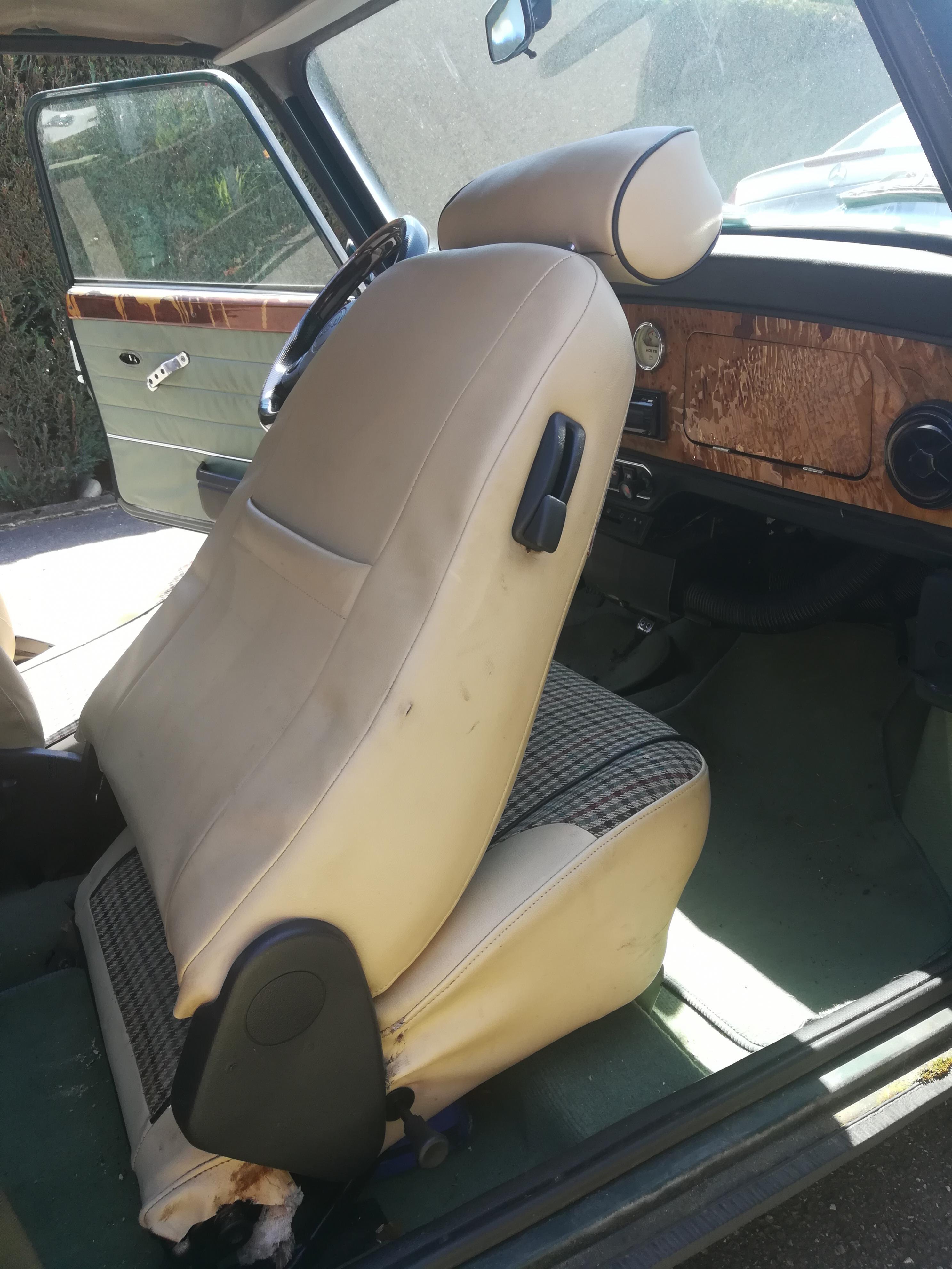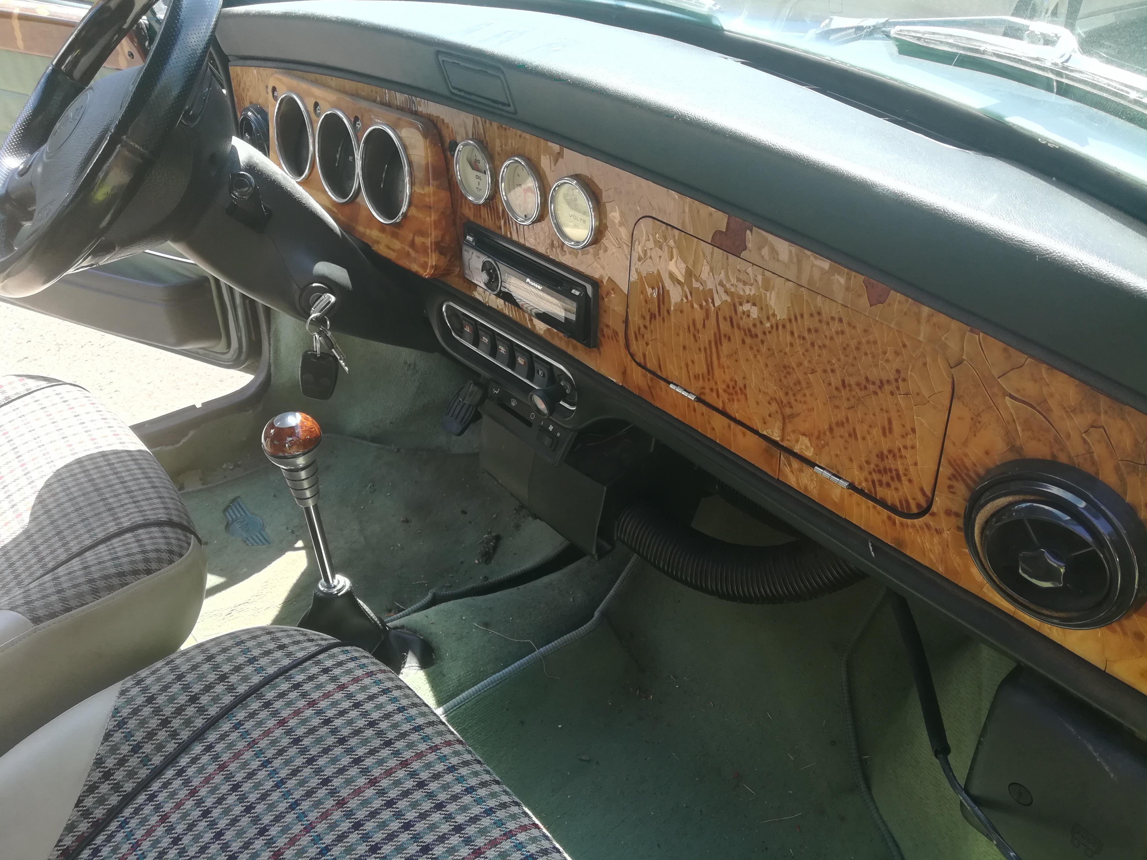 Mini Austin, er hat Holzverkleidung im Innenraum (Lenkrad und Amaturen), Teilledersitze in beige mit Karostoff in der Mitte.
