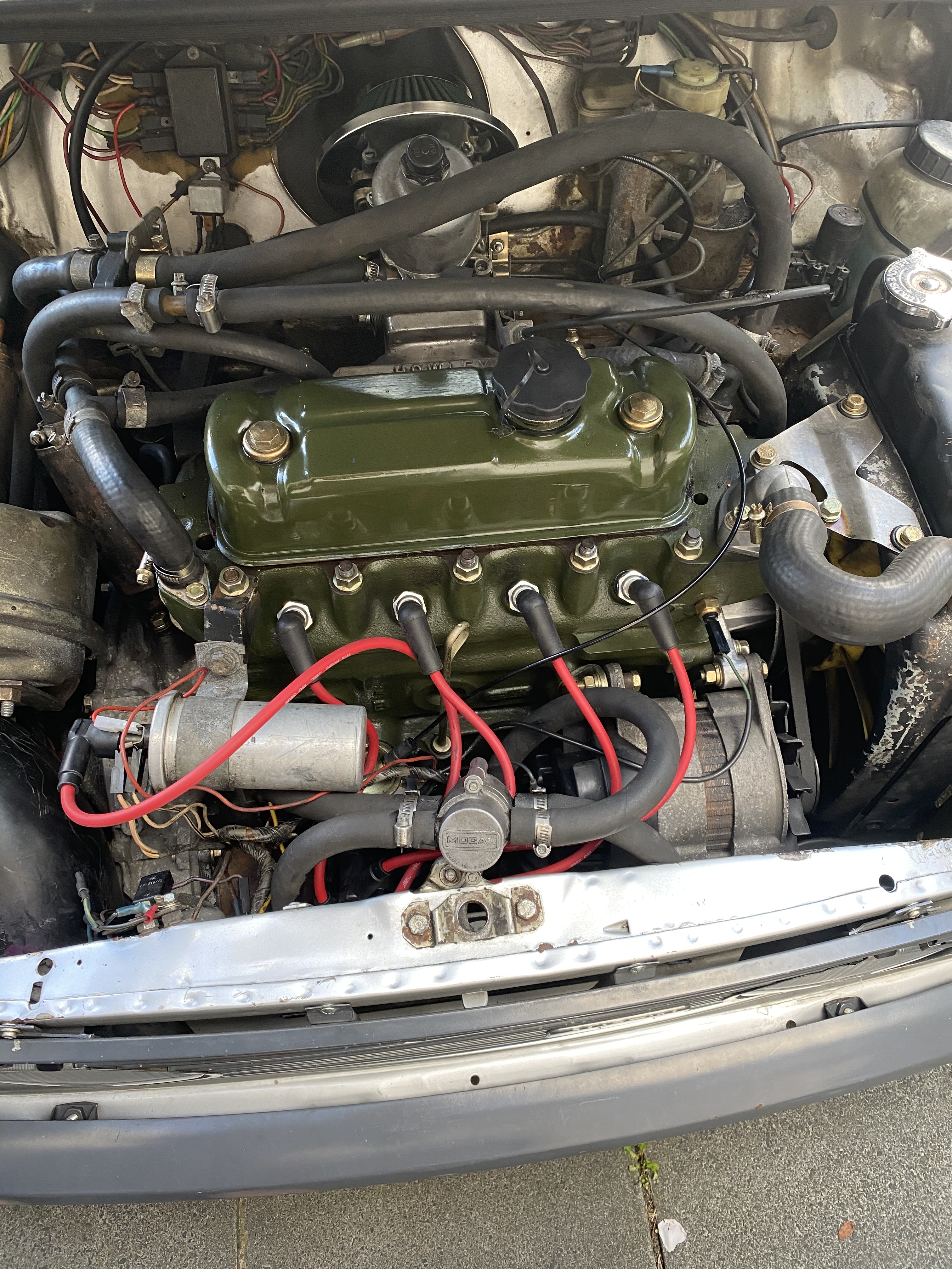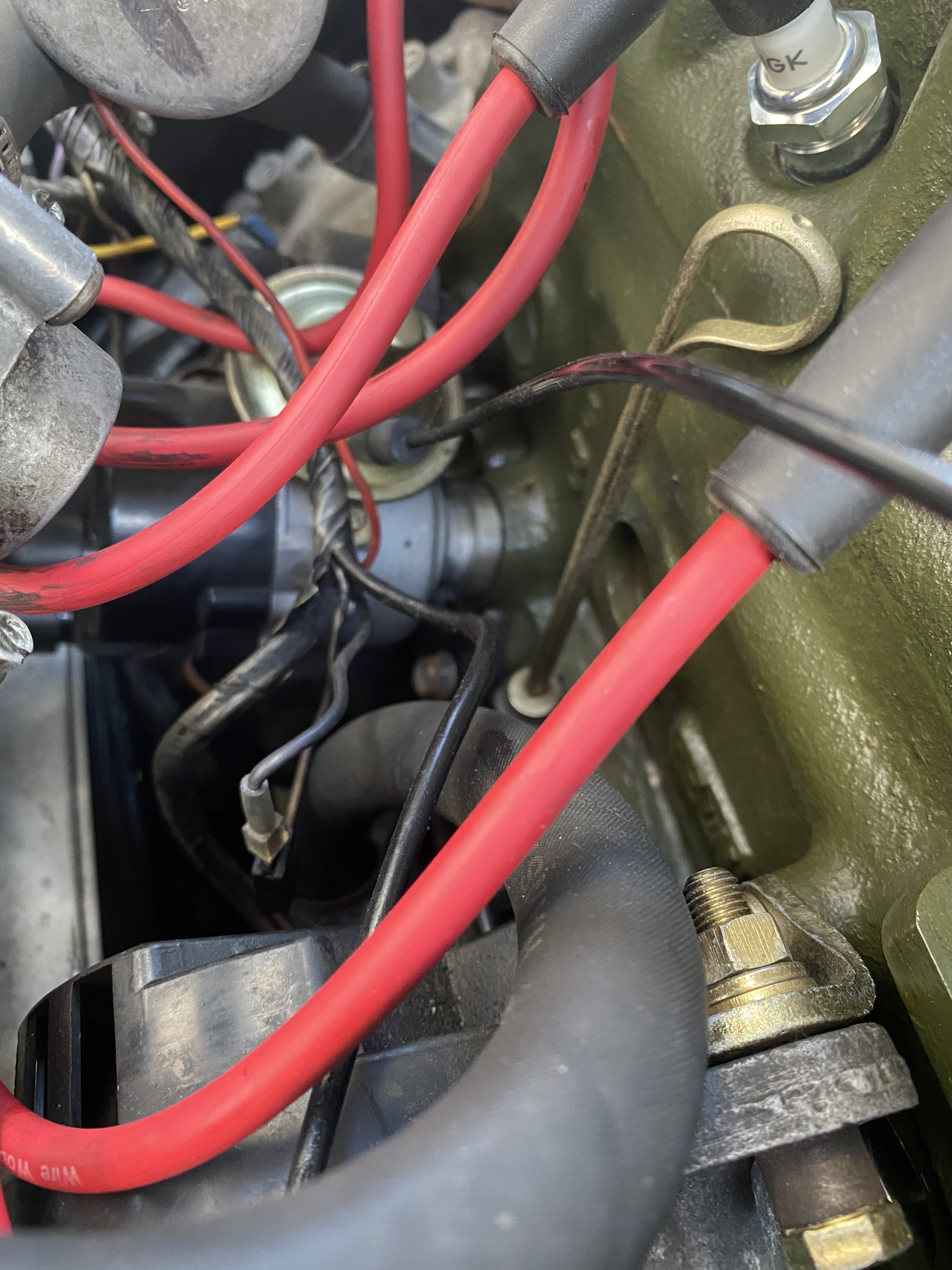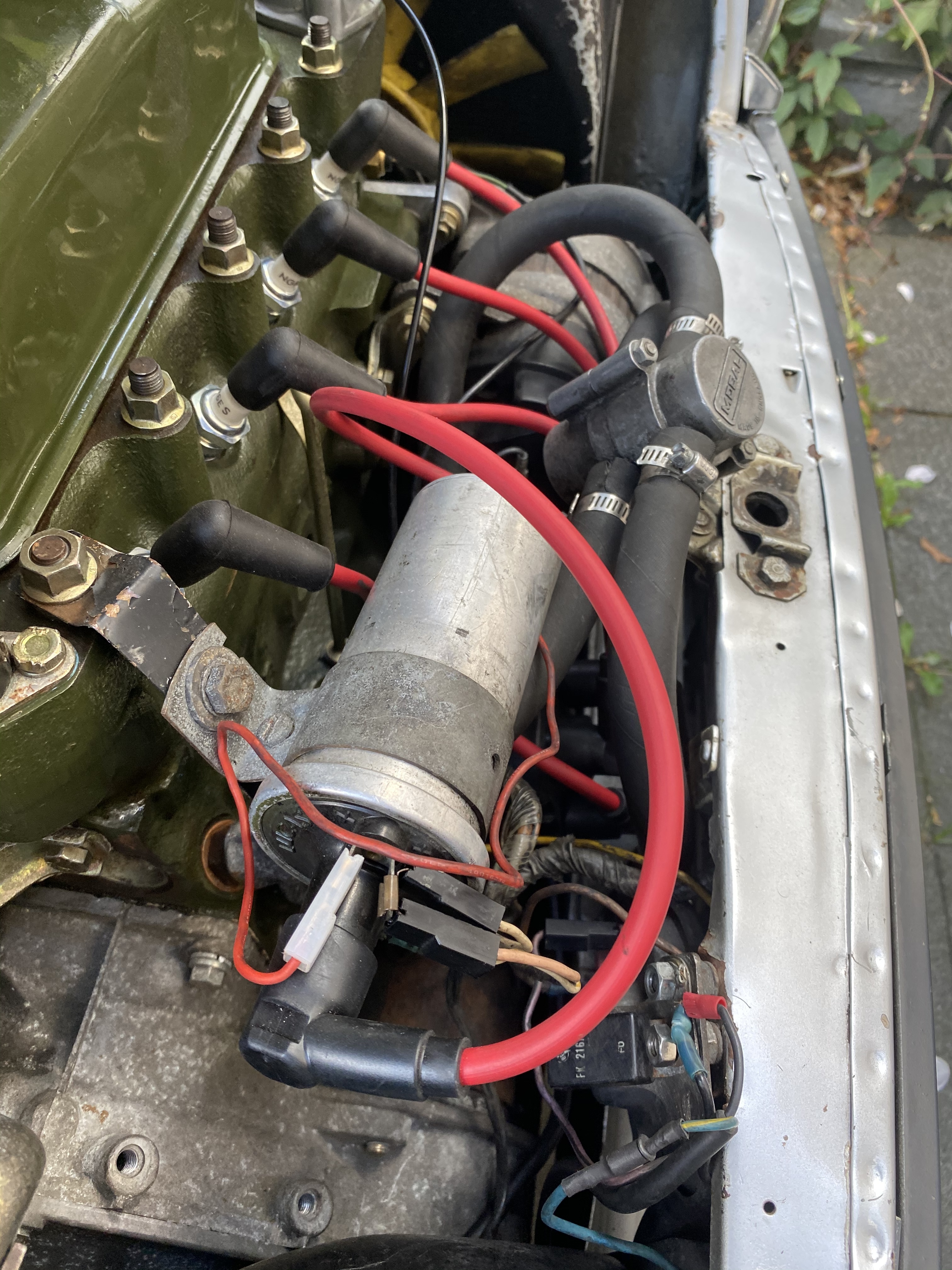 Zum Verteiler: Auf den Fotos erkennt man, dass es ein 59D Verteiler ist. Das sagt aber wiederum nichts über seine Verstellkurve aus. Auf den vorletzten Foto erkennt man, dass 2 Kabel (rot und schwarz) aus dem Verteiler kommen. Das rote Kabel geht zum + Anschluss der Zündspule.