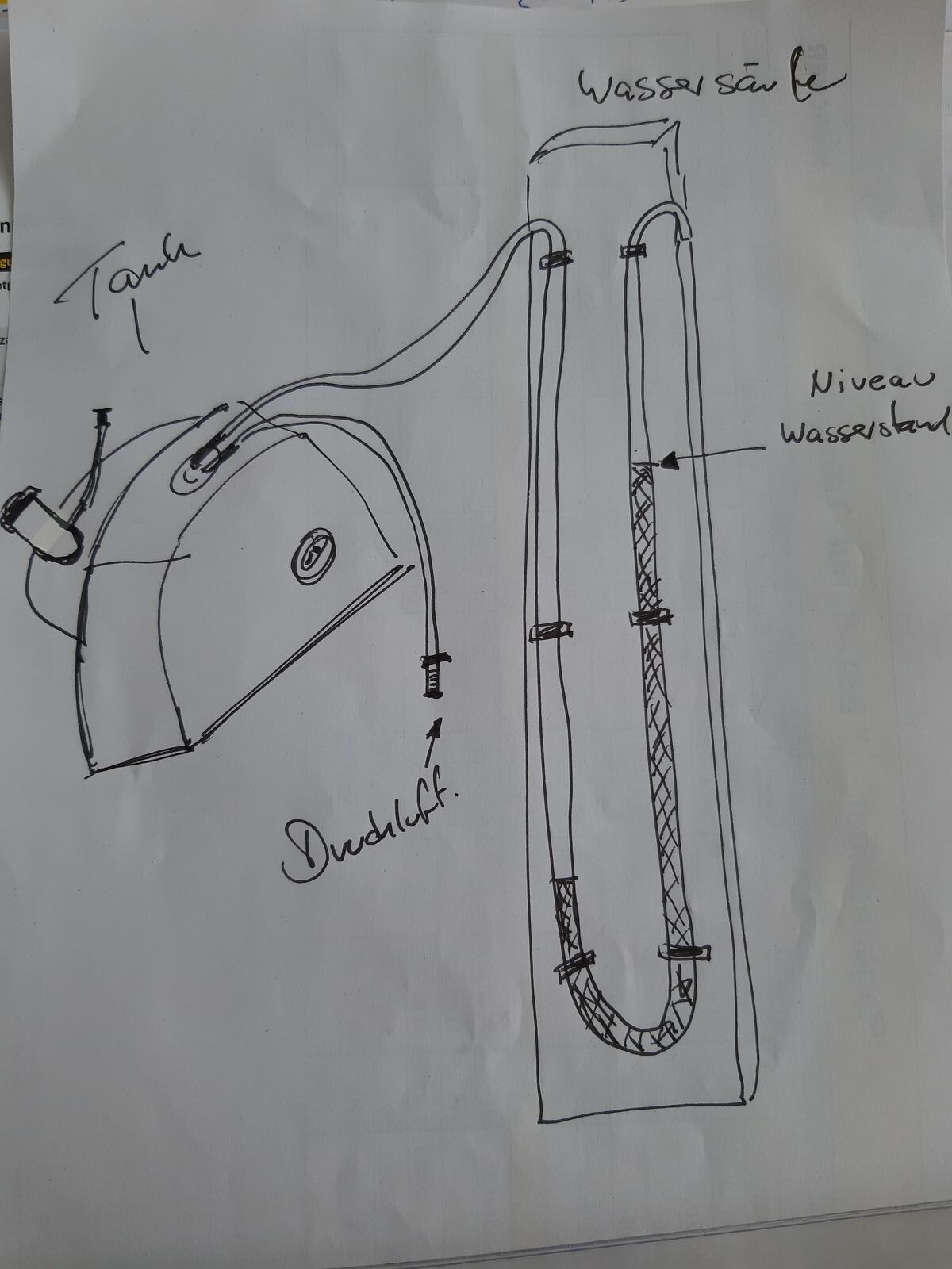 Einer davon sollte etwa 3-4M. lang sein und den auf einem Holzbrett in einer U - Form fixieren und mit etwas Wasser befüllen. (der wird dann zu der Wassersäule )