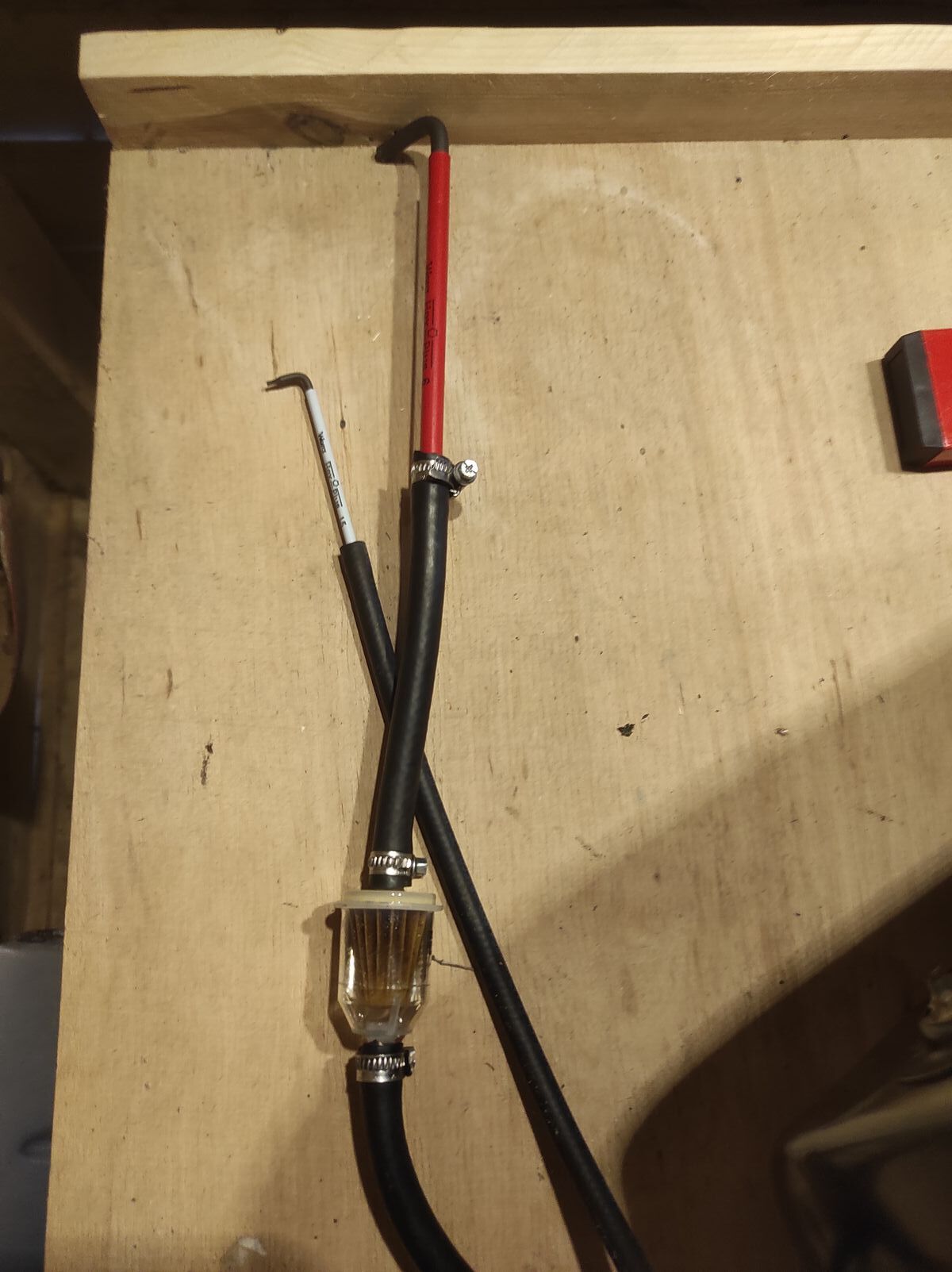den Anderen zum Befüllen des Tank,s mit ein WENIG Druckluft . (wird danach umgeknickt und mit Benzinschlauchklemme oder z. Not Gripzange verschlossen)