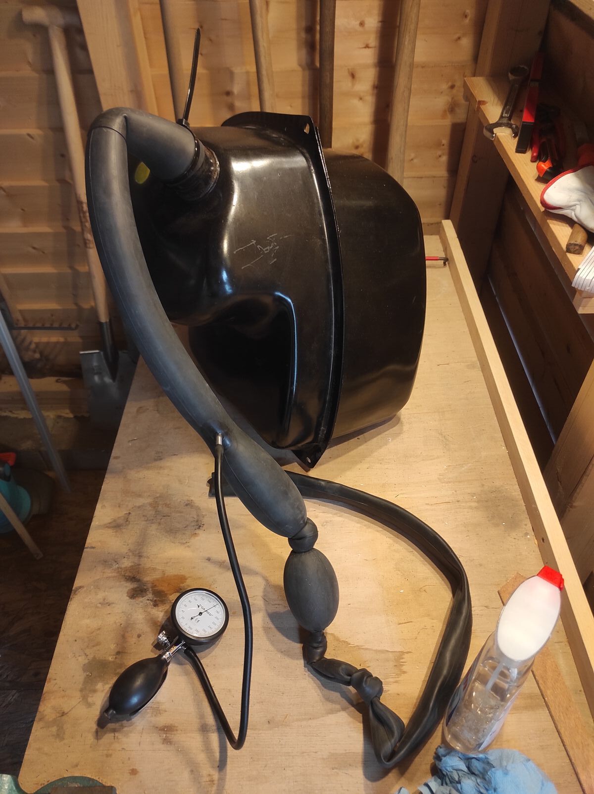 Fahrradschlauch über den Einfüllstutzen würgen und mit einem Kabelbinder sichern. Mit einem Gummiball von einem Blutdruckmessgerät habe ich Druck drauf gegeben. Am Manometer sieht man schön, ob und wie schnell der Druck abfällt.
